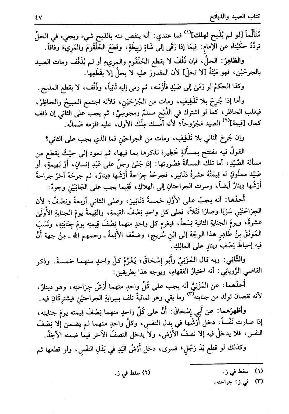 القولُ فيه مفتتح بمسألةٍ خَطِيرة نذكرها بما فيها، ثم نعود إلى حيْثُ يقطع من مسألة الصَّيْدِ، أما تلك المسألةُ فصُورتها: إذا جَنَى رجلٌ على عَبْدِ إنسانٍ، أَوْ بَهيمةِ، أو صَيْد مملُوكٍ له قِيمَتُهُ عشرةُ دَنَانِير، فجرحَهُ جِرَاحةً أَرْشُها دِينارٌ، ثم جرحَهُ آخرُ جراحةً أَرْشُها دِينَارٌ أيضاً، وسرت الجراحتانِ إلى الهلاكِ، فَفِيما يجب على الجَانِبَيْنِ وجوهٌ: