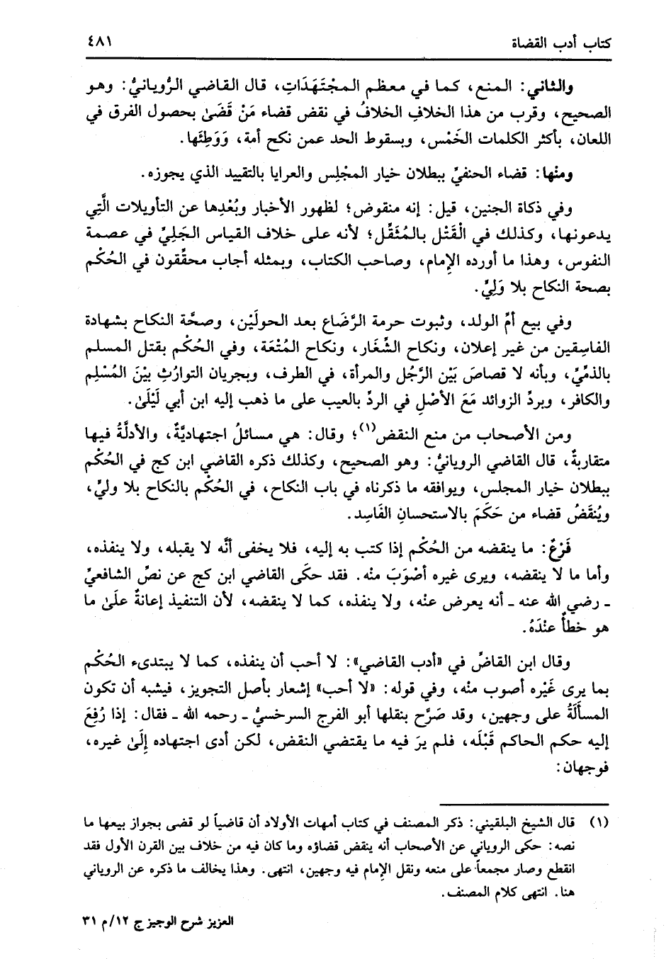 ومن الأصحاب من منع النقض (¬1)؛ وقال: هي مسائلُ اجتهاديَّةٌ، والأدلَّةُ فيها متقاربةٌ، قال القاضي الرويانيُّ: وهو الصحيح، وكذلك ذكره القاضي ابن كج في الحُكْم ببطلان خيار المجلس، ويوافقه ما ذكرناه في باب النكاح، في الحُكْم بالنكاح بلا وليِّ، ويُنقَضُ قضاء من حَكَمَ بالاستحسانِ الفَاسِد.