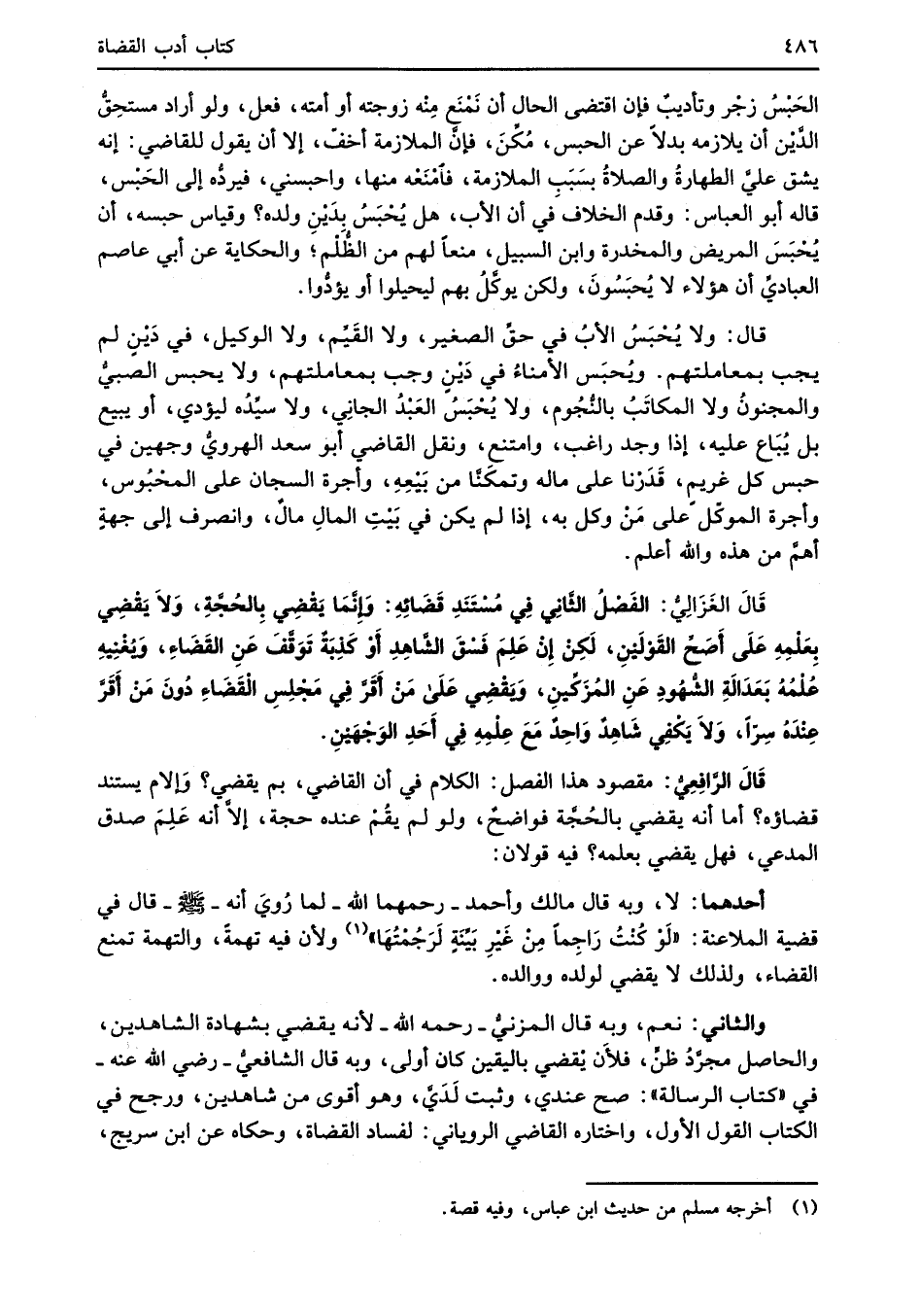 والثاني: نعم، وبه قال المزنيُّ -رحمه الله- لأنه يقضي بشهادة الشاهدين، والحاصل مجرَّدُ ظنٍّ، فلأَن يقضي باليقين كان أولى، وبه قال الشافعيُّ -رضي الله عنه- في "كتاب الرسالة": صح عندي، وثبت لَدَيَّ، وهو أقوى من شاهدين، ورجح في الكتاب القول الأول، واختاره القاضي الروياني: لفساد القضاة، وحكاه عن ابن سريج،