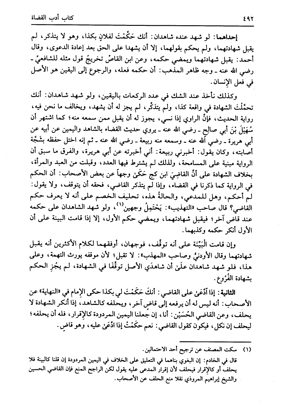وكذلك نأخذ عند الشك في عدد الركعات باليقين، ولو شهد شاهدان: أنك تحمَّلْتَ الشهادة في واقعة كذا، ولم يتذكَّر، لم يجز له أن يشهد، ويخالف ما نحن فيه، رواية الحديث، فإنَّ الراوي إذا نسي، يجوز له أن يقبل ممن سمعه منه؛ كما اشتهر أن سُهَيْلَ بْنَ أبي صالِحٍ -رضي الله عنه- يروي حديث القضاء بالشاهد واليمين عن أبيه عن أبي هريرة -رضي الله عنه- وسمعه منه ربيعة -رضي الله عنه- ثم إنه اختل حفظه بشَجَّة أصابته، وكان يقول: أخبرني ربيعة: أني أخبرته عن أبي هريرة، والفرق ما سبق أن الرواية مبنية على المسامحة، ولذلك لم يشترط فيها العدد، وقبلت من العبد والمرأة، بخلاف الشهادة على أنَّ القاضِيَ ابن كج حَكَى وجهًا عن بعض الأصحاب: أن الحكم في الرواية كما ذكرنا في القضاء، وإذا لم يتذكر القاضي، فحقه أن يتوقف، ولا يقول: لم أحكم، وهل للمدعي، والحالةُ هذه، تحليف الخصم على أنه لا يعرف حكم القاضي؟ قال صاحب "التهذيب": يَحْتَمِلُ وجهين (¬1)، ولو شهد الشاهدان على حكمه عند قاض آخر؛ فيقبل شهادتهما، ويمضي حكم الأول، إلا إذا قامت البينة على أن الأول أنكر حكمه وكذبهما.