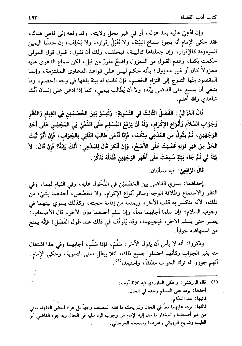 قَالَ الغَزَالِيُّ: الفَصْلُ الثَّالِثُ فِي التَّسْوِيَةِ: وَليُسَوِّ بَيْنَ الخَصْمَينِ فِي القِيَامِ والنَّظَرِ وَجَوَابِ السَّلاَمِ وَأَنْوَاعِ الإِكْرَامِ، وَلَهُ أَنْ يَرْفَعَ المُسْلِمِ عَلَى الذِّمِّيِّ فِي المَجْلِسِ عَلَى أَحَدِ الوَجْهَيْنِ، ثُمَّ يَقُولُ مَنِ المُدَّعِي مِنْكُما، فَإذَا ادَّعَى طَالَبَ الثَّاني بِالجَوَابِ، فَإِنْ أَقَرَّ ثَبَتَ الحَقُّ مِنْ غَيْرِ قَوْلِهِ قَضَيْتُ عَلَى الأَصَحِّ، وَإِنْ أَنْكَرَ قَالَ لِلمُدَّعِي: أَلَكَ بَيِّنَةٌ؟ فَإنْ قَالَ: لاَ بَيِّنَةَ لِي ثُمَّ جَاءَ بَيِّنَةٍ سُمِعَتْ عَلَى أَظْهَر الوَجْهَيْنِ فَلَعَلَّهُ تَذَكَّرَ.