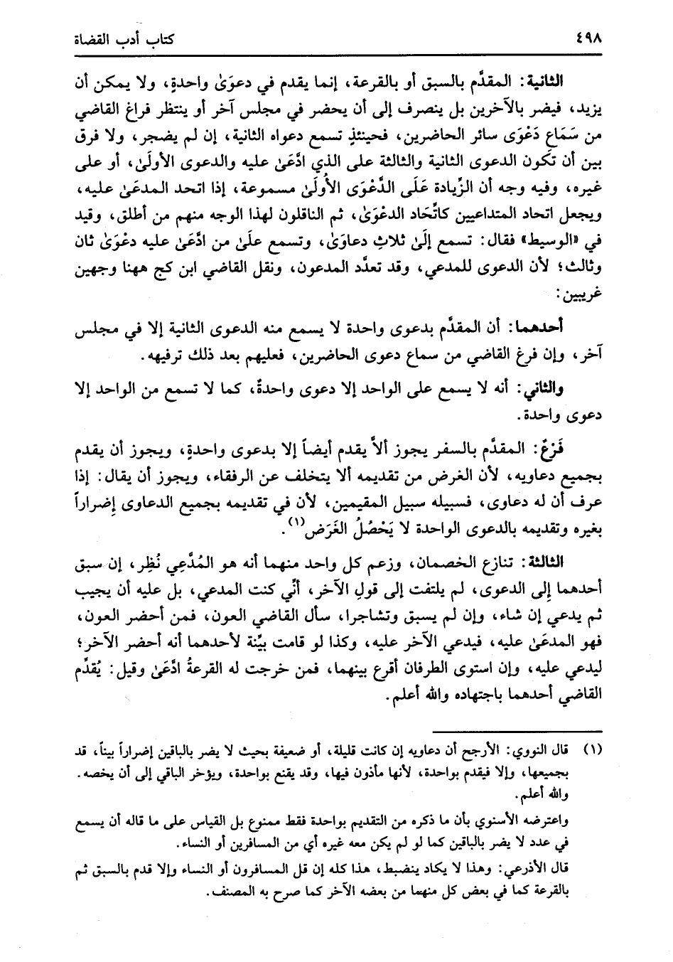 (¬1) قال النووي: الأرجح أن دعاويه إن كانت قليلة، أو ضعيفة بحيث لا يضر بالباقين إضرارًا بينًا، قد بجميعها، وإلا فيقدم بواحدة؛ لأنها مأذون فيها، وقد يقنع بواحدة، ويؤخر الباقي إلى أن يخصه. والله أعلم.