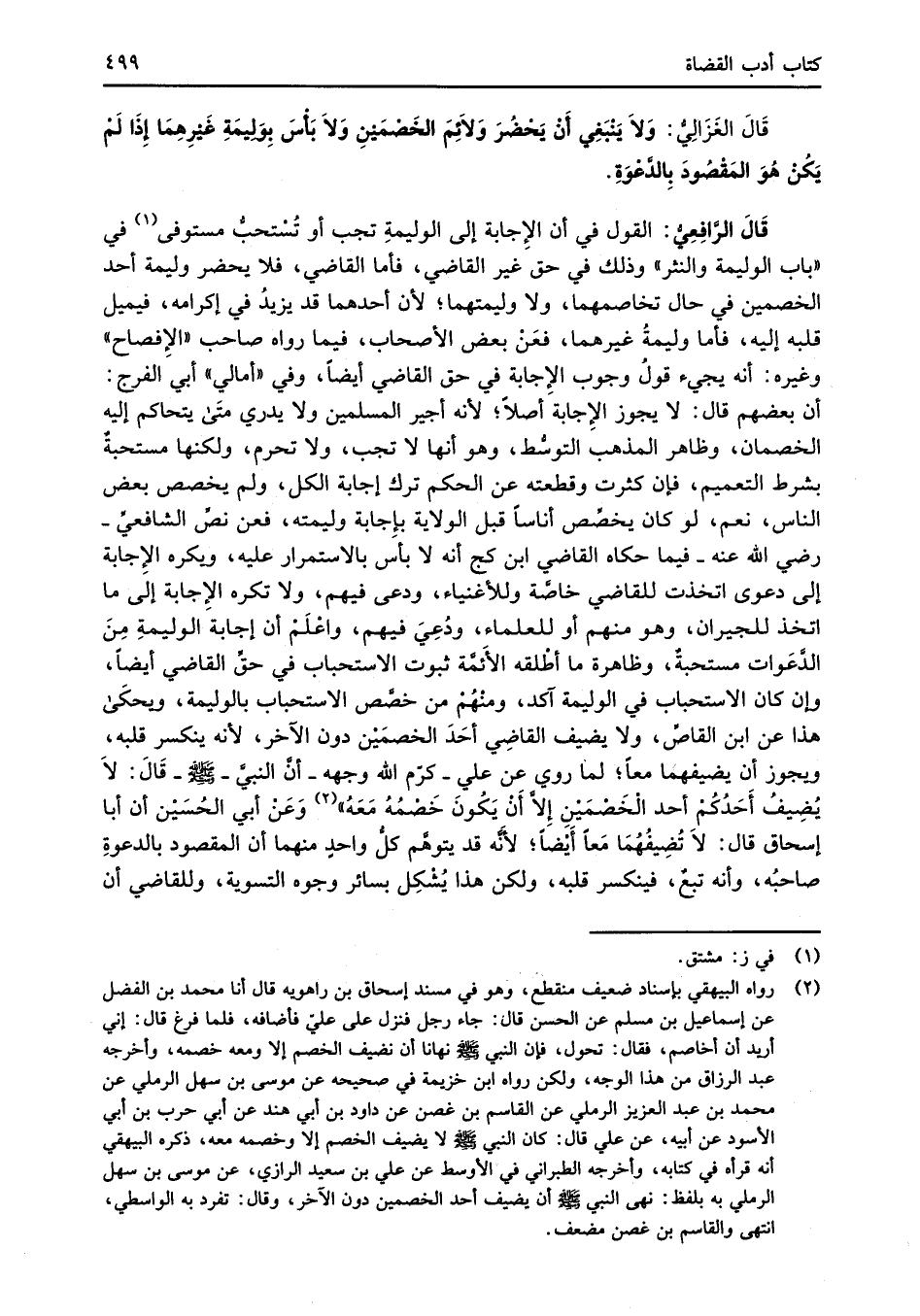قَالَ الرَّافِعِيُّ: القول في أن الإِجابة إلى الوليمةِ تجب أو تُسْتحبُّ مستوفى (¬1) في "باب الوليمة والنثر" وذلك في حق غير القاضي، فأما القاضي، فلا يحضر وليمة أحد الخصمين في حال تخاصمهما، ولا وليمتهما؛ لأن أحدهما قد يزيدُ في إكرامه، فيميل قلبه إليه، فأما وليمةُ غيرهما، فعَنْ بعض الأصحاب، فيما رواه صاحب "الإِفصاح" وغيره: أنه يجيء قولُ وجوب الإجابة في حق القاضي أيضًا، وفي "أمالي" أبي الفرج: أن بعضهم قال: لا يجوز الإِجابةَ أصلاً؛ لأنه أجير المسلمين ولا يدري متَى يتحاكم إليه الخصمان، وظاهر المذهب التوسُّط، وهو أنها لا تجب، ولا تحرم، ولكنها مستحبةٌ بشرط التعميم، فإن كثرت وقطعته عن الحكم ترك إجابة الكل، ولم يخصص بعض الناس، نعم، لو كان يخصِّص أناسًا قبل الولاية بإِجابة وليمته، فعن نصِّ الشافعيِّ -رضي الله عنه- فيما حكاه القاضي ابن كج أنه لا بأس بالاستمرار عليه، ويكره الإِجابة إلى دعوى اتخذت للقاضي خاصَّة وللأغنياء، ودعى فيهم، ولا تكره الإجابة إلى ما اتخذ للجيران، وهو منهم أو للعلماء، ودُعِيَ فيهم، واعْلَمْ أن إجابة الوليمةِ مِنَ الدَّعَوات مستحبةٌ، وظاهرة ما أطْلقه الأَئمَّة ثبوت الاستحباب في حقِّ القاضي أيضًا، وإن كان الاستحباب في الوليمة آكد، ومنْهُمْ من خصَّص الاستحباب بالوليمة، ويحكَى هذا عن ابن القاصِّ، ولا يضيف القاضِي أحَدَ الخصمَيْن دون الآخر؛ لأنه ينكسر قلبه، ويجوز أن يضيفهما معًا؛ لما روي عن علي -كرم الله وجهه- أنَّ النبيَّ -صلى الله عليه وسلم- قَالَ: لاَ يُضِيفُ أحَدُكُمْ أحد الخَصْمَيْنِ إِلاَّ أَنْ يَكُونَ خَصْمُهُ مَعَهُ" (¬2) وَعَن أبي الحُسَيْن أن أبا إسحاق قال: لا تُضِيفُهُمَا مَعًا أَيْضًا؛ لأَنَّه قد يتوهَّم كلُّ واحدٍ منهما أن المقصود بالدعوةِ صاحبُه، وأنه تبعٌ، فينكسر قلبه، ولكن هذا يُشْكِل بسائر وجوه التسوية، وللقاضي أن