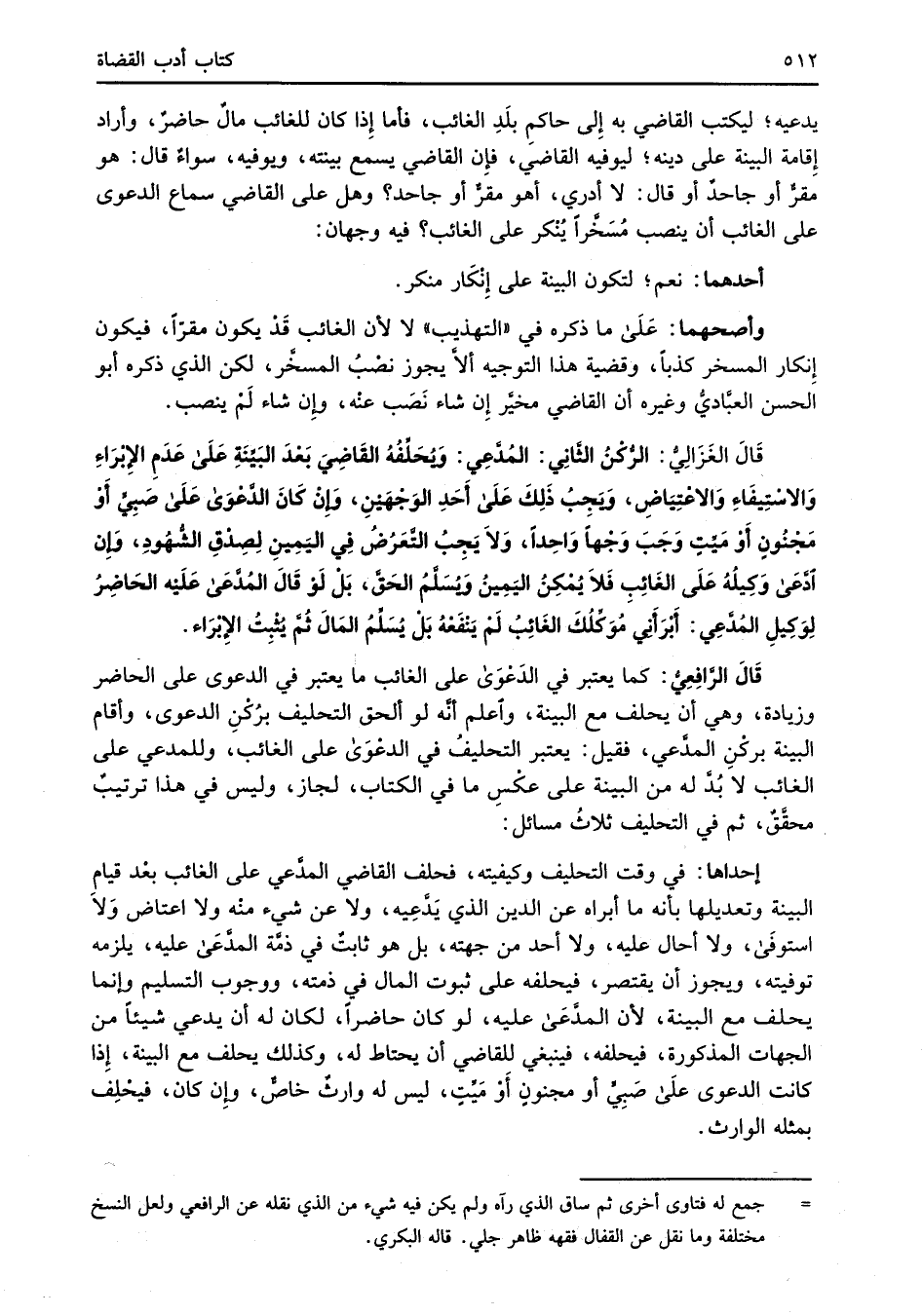 قَالَ الغَزَالِيُّ: الرُّكْنُ الثَّانِي: المُدَّعِي: وَيُحَلِّفُهُ القَاضِيَ بَعْدَ البَيِّنَةِ عَلَى عَدَمِ الإبْرَاءِ والاسْتِيفاءِ والاعْتِيَاضِ، وَيَجِبُ ذَلِكَ عَلَى أَحَدِ الوَجْهَيْنِ، وإِنْ كَانَ الدَّعْوَى عَلَى صَبِيٍّ أَوْ مَجْنُونٍ أَو مَيِّتٍ وَجَبَ وَجْهًا واحِدًا، وَلا يَجِبُ التَّعَرُضُ فِي اليَمِينِ لِصِدْقِ الشُّهُودِ، وَإِن ادَّعَى وَكِيلُهُ عَلَى الغَائِبِ فَلاَ يُمْكِنُ اليَمِينُ وَيُسَلَّمُ الحَقَّ، بَلْ لَوْ قَالَ المُدَّعَى عَلَيْه الحَاضِرُ لِوَكِيلِ المُدَّعِي: أَبْرَأَني مُوَكِّلُكَ الغَائِبُ لَمْ يَنْفَعْهُ بَلْ يُسَلِّمُ المَالَ ثُمَّ يُثْبِتُ الإِبْرَاء.