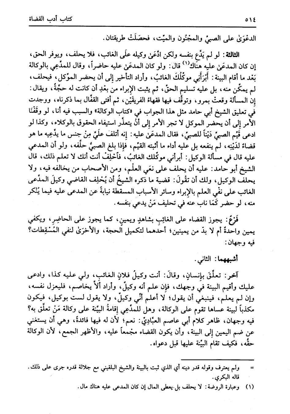 آخر: تعلَّقَ بإِنسانِ، وقالَ: أنت وكيلُ فلانٍ الغائب، ولي عليه كذا، وادعى عليك وأقيم البينة في وجهك، فإن علم أنه وكيلٌ، وأراد أَلاَّ يخاصم، فليعزل نفسه، وإن لم يعلم، فينبغي أن يقول؛ لا أعلم أنِّي وكيلٌ، ولا يقول لست بوكيل، فيكون مكذبًا لبينة عساها تقوم على الوكالة، وهل للمدَّعِي إِقامةُ البيَّنة على وكالة مَنْ تعلَّق به؟ فيه وجهان، ظاهر كلام أبي عاصم العبَّادِيِّ: نعم؛ لأن له فيها فائدةً، وهي أن يستغني عني ضم اليمين إِلى البينة، وأن يكون القضاء مجْمعًا عليه، والأظهر الجمع؛ لأن الوكالة حقُّه، فكيف تقام البيِّنة عليها قبل دعواه.