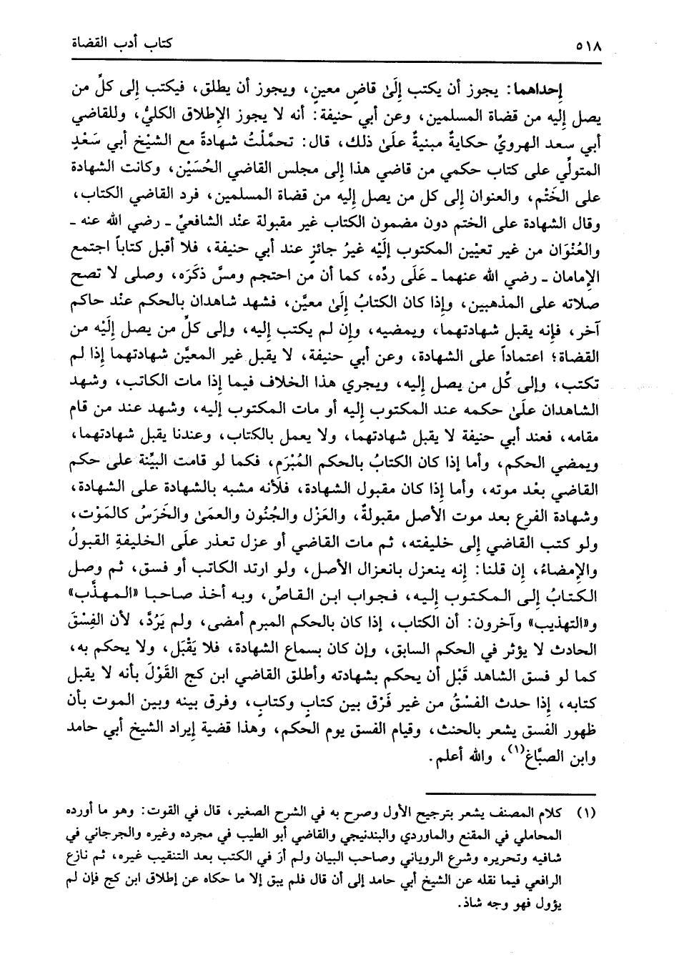 إِحداهما: يجوز أن يكتب إلى قاضٍ معينٍ، ويجوز أن يطلق، فيكتب إِلى كلِّ من يصل إِليه من قضاة المسلمين، وعن أبي حنيفة: أنه لا يجوز الإِطلاق الكليُّ، وللقاضي أبي سعد الهرويِّ حكايةٌ مبنيةٌ عَلَى ذلك، قال: تحمَّلْتُ شهادةٌ مع الشيْخ أبي سَعْدٍ المتولِّي على كتاب حكمي من قاضي هذا إِلى مجلس القاضي الحُسَيْن، وكانت الشهادة على الخَتْم، والعنوان إِلى كل من يصل إليه من قضاة المسلمين، فرد القاضي الكتاب، وقال الشهادة على الختم دون مضمون الكَتاب غير مقبولة عنْد الشَّافعيِّ -رضي الله عنه- والعُنْوَان من غير تعيْين المكتوب إلَيْه غيرُ جائزٍ عند أبي حنيفة، فلا أقبل كتابًا اجتمع الإمامان -رضي الله عنهما- عَلَى ردِّه، كما أن من احتجم ومسَّ ذكَرَه، وصلى لا تصح صلاته على المذهبين، وإذا كان الكتابُ إلى معيَّن، فشهد شاهدان بالحكم عنْد حاكم آخر، فإنه يقبل شهادتهما، ويمضيه، وإن لم يكتب إِليه، وإلى كلِّ من يصل إِلَيْه من القضاة؛ اعتمادًا على الشهادة، وعن أبي حنيفة، لا يقبل غير المعيَّن شهادتهما إِذا لم تكتب، وإلى كل من يصل إِليه، ويجري هذا الخلاف فيما إِذا مات الكاتب، وشهد الشاهدان عَلَى حكمه عند المكتوب إِليه أو مات المكتوب إليه، وشهد عند من قام مقامه، فعند أبي حنيفة لا يقبل شهادتهما، ولا يعمل بالكتاب، وعندنا يقبل شهادتهما، ويمضي الحكم، وأما إذا كان الكتابُ بالحكم المُبْرَم، فكما لو قامت البيِّنة على حكم القاضي بعْد موته، وأما إِذا كان مقبول الشهادة، فلأنه مشبه بالشهادة على الشهادة، وشهادة الفرع بعد موت الأصل مقبولةٌ، والعَزْل والجُنُون والعمَى والخَرَسُ كالمَوْت، ولو كتب القاضي إِلى خليفته، ثم مات القاضي أو عزل تعذر علَى الخليفةِ القبولُ والإمضاءُ، إِن قلنا: إِنه ينعزل بانعزال الأصل، ولو ارتد الكاتب أو فسق، ثم وصل الكتابُ إِلى المكتوب إِليه، فجواب ابن القاصِّ، وبه أخذ صاحبا "المهذَّب" و"التهذيب" وآخرون: أن الكتاب، إذا كان بالحكم المبرم أمضى، ولم يَرُدَّ؛ لأن الفِسْقَ الحادث لا يؤثر في الحكم السابق، وإن كان بسماع الشهادة، فلا يَقْبَل، ولا يحكم به، كما لو فسق الشاهد قَبْل أن يحكم بشهادته وأطلق القاضي ابن كج القَوْلَ بأنه لا يقبل كتابه، إِذا حدث الفسْقُ من غير فَرْق بين كتابٍ وكتابٍ، وفرق بينه وبين الموت بأن ظهور الفسق يشعر بالحنث، وقيام الفسق يوم الحكم، وهذا قضية إِيراد الشيخ أبي حامد وابن الصبَّاغ (¬1)، والله أعلم.