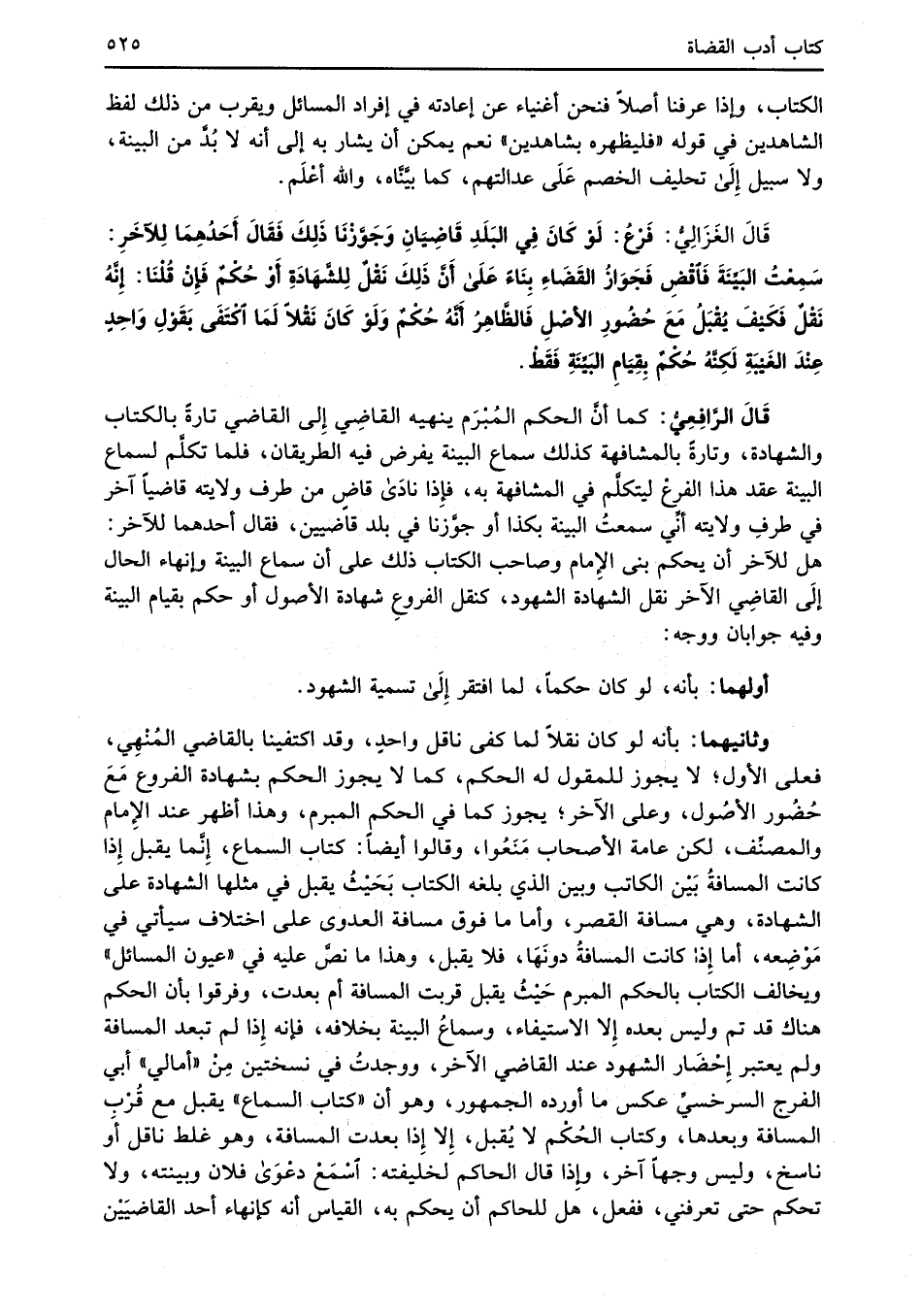 قَالَ الرَّافِعِيُّ: كما أنَّ الحكم المُبْرَم ينهيه القاضِي إِلى القاضي تارةً بالكتاب والشهادة، وتارةً بالمشافهة كذلك سماع البينة يفرض فيه الطريقان، فلما تكلَّم لسماع البينة عقد هذا الفرعْ ليتكلَّم في المشافهة به، فإِذا نادَى قاضٍ من طرف ولايته قاضياً آخر في طرفِ ولايته أنِّي سمعتُ البينة بكذا أو جوَّزنا في بلد قاضيين، فقال أحدهما للآخر: هل للآخر أن يحكم بني الأِمام وصاحب الكتاب ذلك على أن سماع البينة وإنهاء الحال إلَى القاضِي الآخر نقل الشهادة الشهود، كنقل الفروعِ شهادة الأصول أو حكم بقيام البينة وفيه جوابان ووجه: