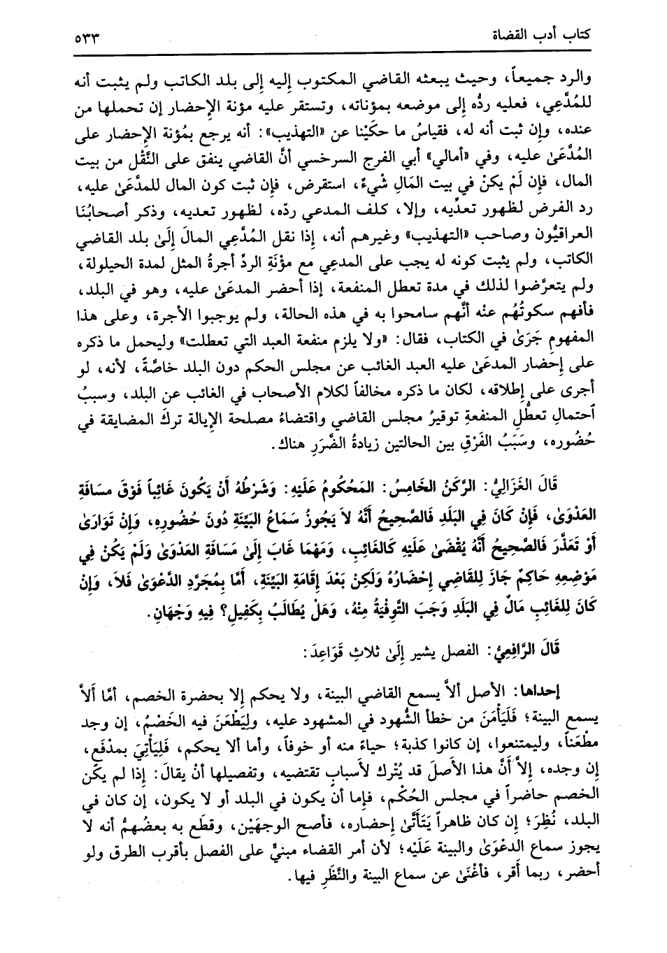 قَالَ الغَزَالِيُّ: الرَّكَنُ الخَامِسُ: المَحُكُومُ عَلَيْهِ: وَشَرْطُهُ أَنْ يَكُونَ غَائِباً فَوْقَ مسَافَةِ العَدْوَى، فَإِنْ كَانَ فِي البَلَدِ فَالصَّحِيحُ أنَّهُ لاَ يَجُوزُ سَمَاعُ البَيِّنَةِ دُونَ حُضُورِهِ، وَإِنْ تَوَارَى أَوْ تَعَذَّرَ فَالصَّحِيحُ أنَّهُ يُقْضَى عَلَيْهِ كَالغَائِبِ، وَمَهْمَا غَابَ إِلَى مَسَافَةِ العَدْوَى وَلَمْ يَكُنْ فِي مَوْضِعِهِ حَاكِمٌ جَازَ لِلقَاضِي إِحْضَارُهُ وَلَكِنْ بَعْدَ إِقَامَةِ البَيِّنَةِ، أَمَّا بِمُجرَّدِ الدَّعْوَى فَلاَ، وَإِنْ كَانَ لِلغَائِبِ مَالٌ فِي البَلَدِ وَجَبَ التَّوِفْيَةُ مِنْهُ، وَهَلْ يُطَالَبُ بِكَفِيلِ؟ فِيهِ وَجْهَانِ.