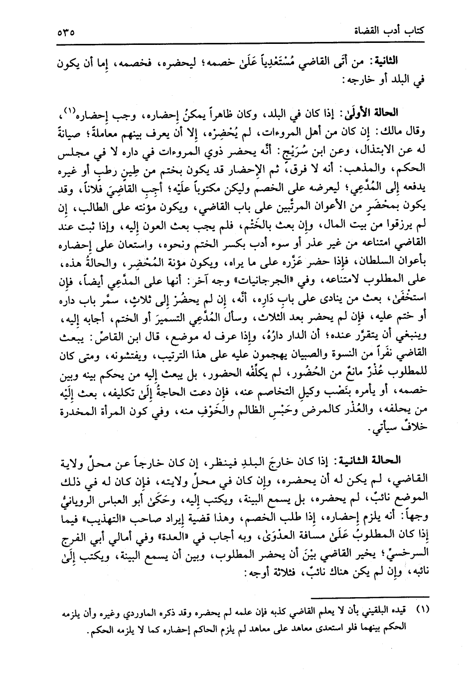 الحالة الأولَى: إذا كان في البلد، وكان ظاهراً يمكنُ إِحضاره، وجب إِحضاره (¬1)، وقال مالك: إِن كان من أهل المروءات، لم يُحْضِرْه، إِلا أن يعرف بينهم معاملةً؛ صيانةً له عن الابتذال، وعن ابن سُرَيْجٍ: أنَّه يحضر ذوي المروءات في داره لا في مجلس الحكم، والمذهب: أنه لا فرق، ثم الإحضار قد يكون بختم من طِينٍ رطبٍ أو غيره يدفعه إِلى المُدَّعِي؛ ليعرضه على الخصمَ وليكن مكتوباً علَيْه؛ أجِبِ القاضِيَ فَلاناً، وقد يكون بمحْضَرِ من الأعوان المرتَّبين على باب القاضي، ويكون مؤنته على الطالب، إِن لم يرزقوا من بيت المال، وإِن بعث بالخَتْم، فلم يجب بعث العون إِليه، وإذا ثبت عند القاضي امتناعه من غير عذر أو سوء أدب بكسر الختم ونحوه، واستعان على إِحضاره بأعوان السلطان، فإِذا حضر عَزَّره على ما يراه، ويكون مؤنة المُحْضِر، والحالةُ هذه، على المطلوب لامتناعه، وفي "الجرجانيات" وجه آخر: أنها على المدَّعِي أيضاً، فإِن استخْفَى، بعث من ينادى على باب دَارِه، أنَّه، إِن لم يحضُرْ إِلى ثلاثٍ، سمَّر باب داره أو ختم عليه، فإِن لم يحضر بعد الَثلاث، وسال المُدَّعِي التسميرَ أو الختم، أجابه إِليه، وينبغي أن يتقرَّر عنده؛ أن الدار دارُهُ، دماِذا عرف له موضع، قال ابن القاصِّ: يبعث القاضي نفَراً من النسوة والصبيان يهجمون عليه على هذا الترتيب، ويفتشونه، ومتى كان للمطلوب عُذْرٌ مانعٌ من الحُضُور، لم يكلِّفْه الحضور، بل يبعث إِليه من يحكم بينه وبين خصمه، أو يأمره بنَصْب وكيلِ التخاصم عنه، فإن دعت الحاجةُ إلَى تكليفه، بعث إِلَيْه من يحلفه، والعُذْر كالمرض وحَبْسِ الظالم والخَوْفِ منه، وفي كون المرأة المخدرة خلافٌ سيأتي.