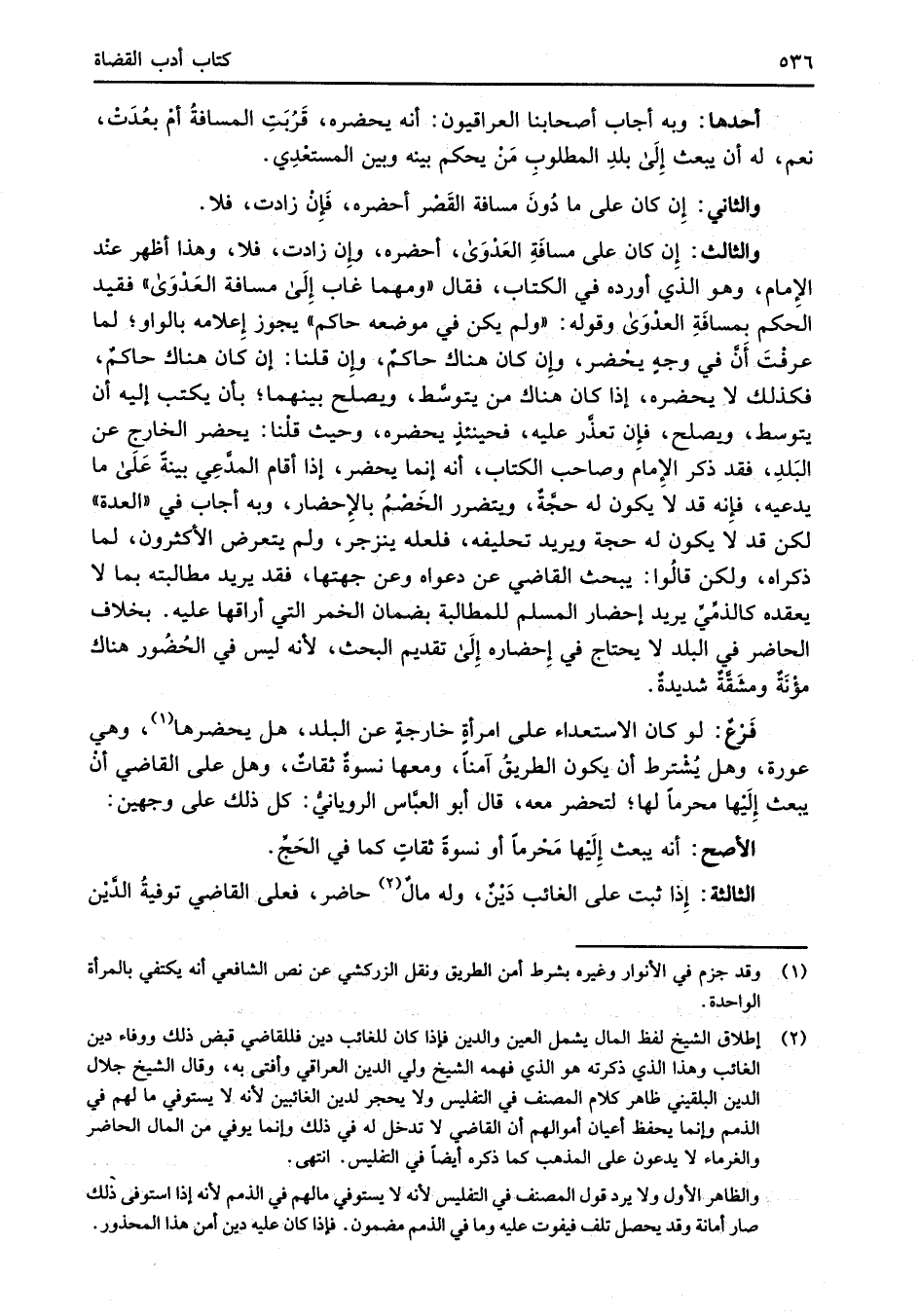 والثالث: إِن كان على مسافَةِ العَدْوَى، أحضره، وإِن زادت، فلا، وهذا أظهر عنْد الإِمام، وهو الذي أورده في الكتاب، فقال "ومهما غاب إلى مسافة العَدْوَى" فقيد الحَكم بمسافَةِ العدْوَى وقوله: "ولم يكن في موضعه حاكم" يجوز إِعلامه بالواو؛ لما عرفْتَ أَنَّ في وجهٍ يحْضر، وإن كان هناك حاكمٌ، لماِن قلنا: إن كان هناك حاكمٌ، فكذلك لا يحضره، إذا كان هناك من يتوسَّط، ويصلح بينهما؛ بان يكتب إليه أن يتوسط، ويصلح، فإِن تعذَّر عليه، فحينئذ يحضره، وحيث قلْنا: يحضر الخارج عن البَلدِ، فقد ذكر الإِمام وصاحب الكتاب، أنه إنما يحضر، إذا أقام المدَّعِي بينةً عَلَى ما يدعيه، فإنه قد لا يكون له حجَّةٌ، ويتضرر الخَصْمُ بالإِحضار، وبه أجاب في "العدة" لكن قد لا يكون له حجة ويريد تحليفه، فلعله ينزجر، ولم يتعرض الأكثرون، لما ذكراه، ولكن قالُوا: يبحث القاضي عن دعواه وعن جهتها، فقد يريد مطالبته بما لا يعقده كالذمِّيِّ يريد إحضار المسلم للمطالبة بضمان الخمر التي أراقها عليه. بخلاف الحاضر في البلد لا يحتاج في إِحضاره إِلَى تقديم البحث؛ لأنه ليس في الحُضُور هناك مؤْنَةٌ ومشَقَّةٌ شديدةٌ.