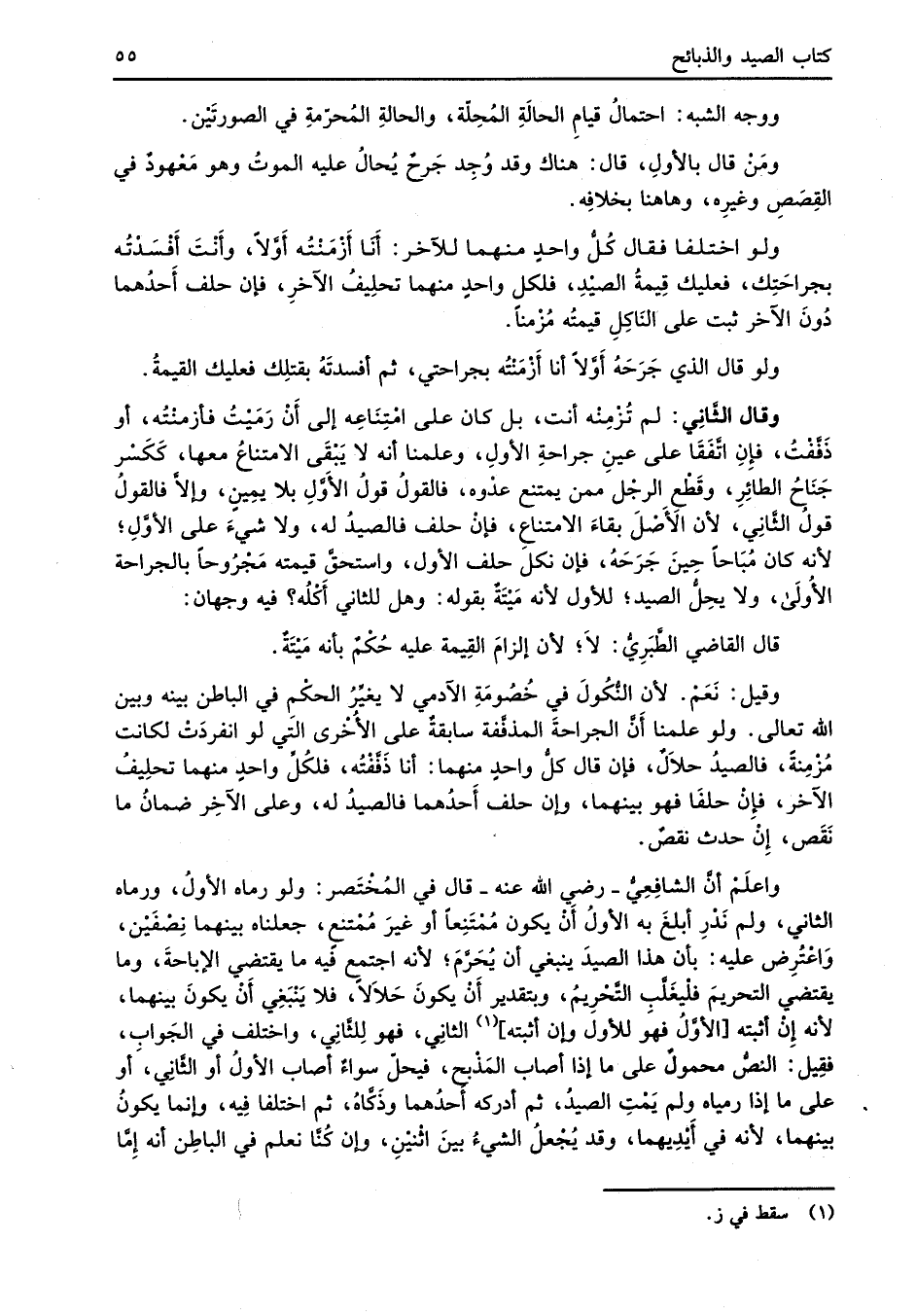 وقال الثَّانِي: لم تُزْمِنْه أنت، بل كان على امْتِنَاعِه إلى أَنْ رَمَيْتُ فأزمنْتُه، أو دَفَّفْتُ، فإنِ اتَّفَقَا على عينِ جراحةِ الأولِ، وعلمنا أنه لا يَبْقَى الامتناعُ معها، كَكَسْر جَنَاحُ الطائِرِ، وقَطْع الرجْل ممن يمتنع عدْوه، فالقولُ قولُ الأَوَّلِ بلا يمِينٍ، وإلاَّ فالقولُ قولُ الثَّانِي؛ لأن الأَصْلَ بقاءَ الامتناعِ، فإنْ حلف فالصيدُ له، ولا شيءَ على الأوَّلِ؛ لأنه كان مُبَاحًا حِينَ جَرَحَهُ، فإن نكل حلف الأول، واستحقَّ قيمته مَجْرُوحًا بالجراحة الأُولَى، ولا يحِلُّ الصيد؛ للأول لأنه مَيْتَةٌ بقوله: وهل للثاني أَكْلُه؟ فيه وجهان: