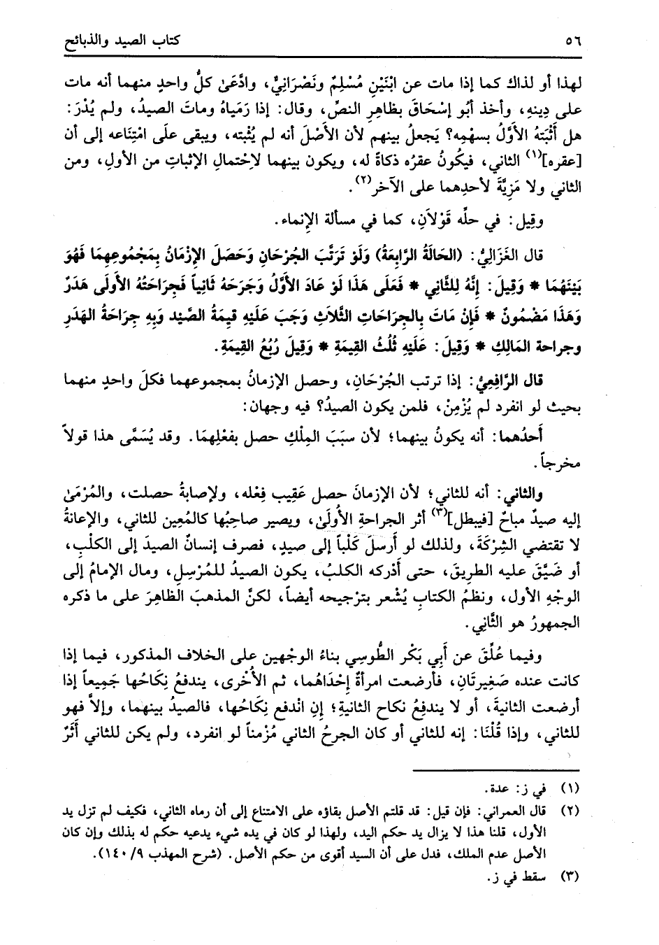 قال الغَزَالِيُّ: (الحَالَةُ الرَّابِعَة) وَلَوْ تَرَتَّبَ الجُرْحَانِ وَحَصَلَ الإزْمَانُ بِمَجْمُوعِهِمَا فَهُوَ بَيْنَهُمَا* وَقِيلَ: إِنَّهُ لِلثَّانِي* فَعَلَى هَذَا لَوْ عَادَ الأَوَّل وَجَرَحَهُ ثَانِياً فَجِرَاحَتُهُ الأَولَى هَدَرٌ وَهَذَا مَضْمُونٌ* فَإنْ مَاتَ بِالجِرَاحَاتِ الثَّلاَثِ وَجَبَ عَلَيْهِ قيمَةُ الصَّيْد وَبِهِ جِرَاحَةُ الهَدَرِ وجراحة المَالِكِ* وَقِيلَ: علَيْهِ ثلُثُ القِيمَةِ* وَقِيلَ رُبُعُ القِيمَةِ.