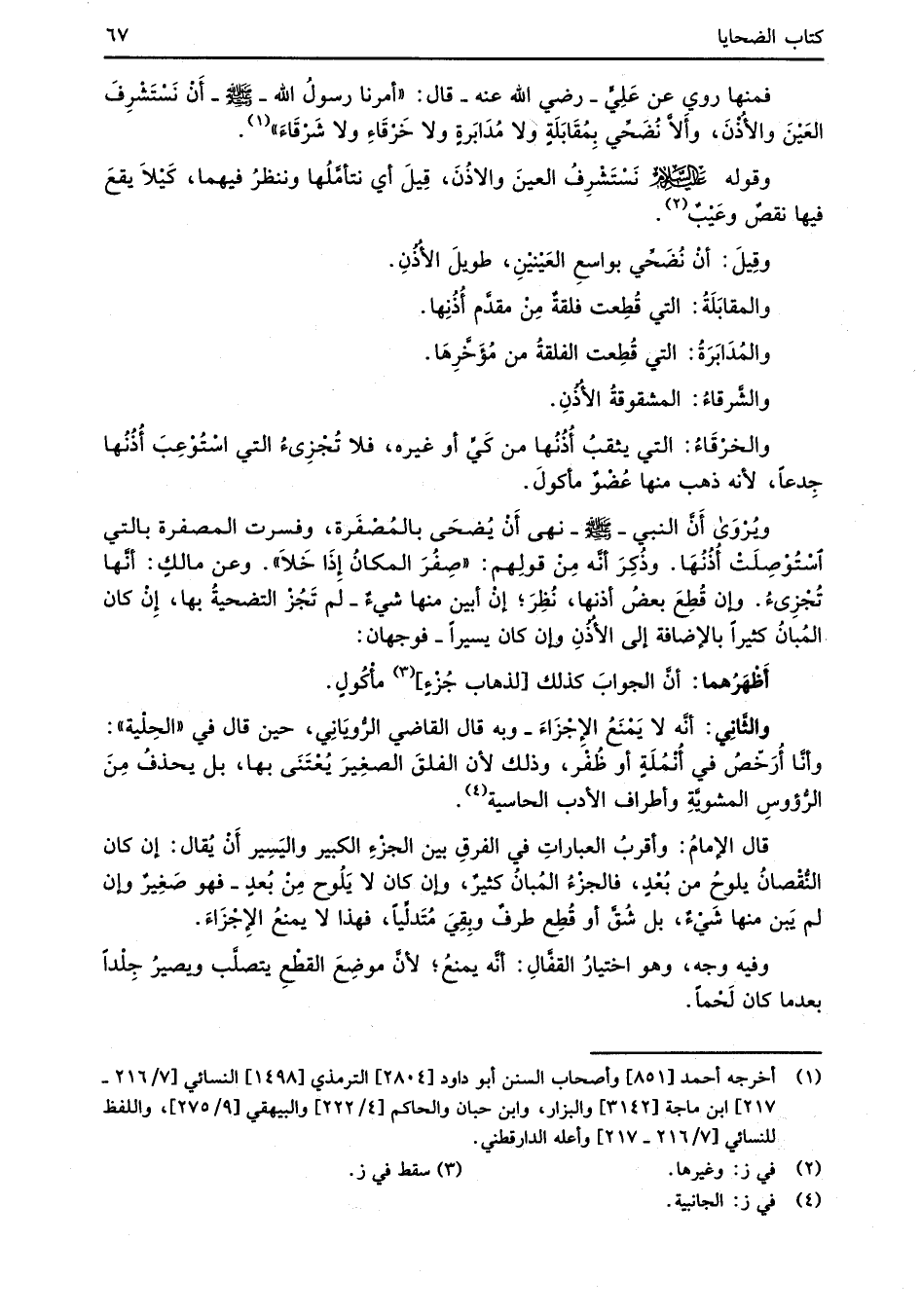 فمنها رويِ عن عَلِيٍّ -رضي الله عنه- قال: "أمرنا رسولُ الله -صلى الله عليه وسلم- أَنْ نَسْتَشْرِفَ العَيْنَ والأُذْنَ، وألاَّ نُضَحِّي بِمُقَابَلَةٍ ولا مُدَابَرةٍ ولا خَرْقَاءِ ولا شَرْقَاءَ" (¬1).