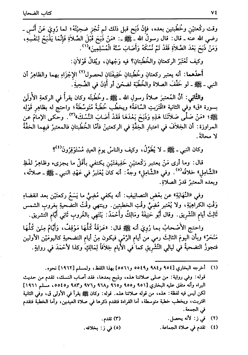 قوله: وفي رواية: من صلى صلاتنا هذه، وذبح بعدها، فقد أصاب النسك، تقدم من حديث البراء وأنه متفق عليه البخاري [951 و 955 و 965 و 968 و 976 و 983 و 5545، مسلم 1961] لكن ليس فيه لفظة: هذه، من قوله صلاتنا هذه. قوله: وكان -صلى الله عليه وسلم- يقرأ في الأولى ق، وفي الثانية اقتربت، ويخطب خطبة متوسطة، أما القراءة فقدم ذكرها في صلاة العيدين، وأما الخطبة فتقدم في الجمعة.