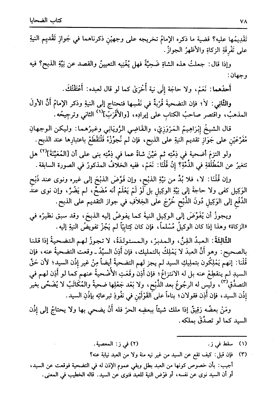 وإن قُلْنَا: لا، فلا بُدَّ من نيَّةِ الذبْح، وإن فوَّضَ الذبْحَ إلى غيره ونوى عند ذَبْحِ الوَكِيل كفى ولا حاجةَ إلى نِيَّةِ الوكِيلِ بلَ لَوْ لَمْ يعْلَمْ أنه مُضَحٍّ، لم يَضُرَّ، وإن نوى عند الدَّفْعِ إلى الوَكِيلِ دُونَ الذَّبْحِ خُرِّجَ على الخِلاَفِ في جواز التقديم على الذبح.