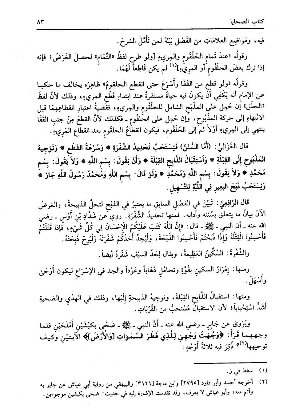 ومنها: إِمْرَارُ السكينِ بقُوَّةٍ وتحامُلٍ ذَهَاباً وعَوْداً والجد في الإسْرَاعِ ليكون أَوْحَى وأَسْهَلَ.