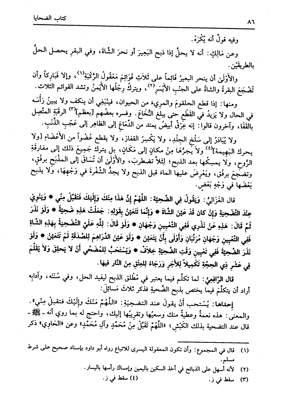 إِحداها: يُسْتحب أَنْ يقولَ عند التضحِيَةِ: "اللَّهُمَّ مَنْكَ وإِلَيْكَ فتقبلْ مِنّي". والمعنى: هذه نعمةٌ وعطيةٌ منك وسعيُها وتقرِيبُها إليك، واحتج له بما روي أنه -صلى الله عليه وسلم- قال عند التضحية بذلك الكَبْشِ؛ "اللَّهُمَّ تَقَبَّلْ مِنْ مُحَمَّدٍ وآلِ مُحَمَّدٍ" وعن "الحَاوِي" ذكر