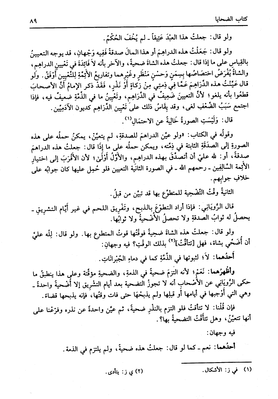 وقولُه في الكتاب: "ولو عيَّن الدراهمَ للصدقةِ، لم يتعيَّنْ، يمكنُ حملُه على هذه الصورةِ إلى الصدَقَةِ الثابتة في ذِمَّته، ويمكن حملُه على ما إِذَا قال: جعلتُ هذه الدراهمَ صدقةً، أو: لله عليّ أن أتصدَّقَ بهذه الدراهِمِ، والأَوَّلُ أَوْلَى؛ لأن الأَقْرَبَ إلى اختيارِ الأَئِمة السَّالِفِين -رحمهم الله- في الصورة الثانية التعيين فلو حُمِل عليها كان جوابُه على خلافِ جوابِهم.