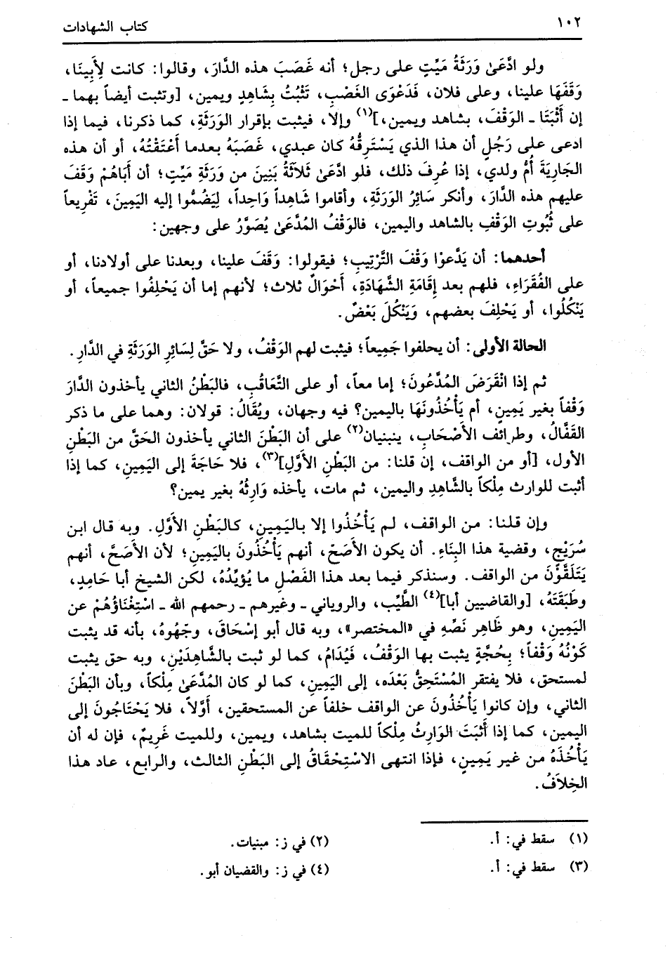أحدهما: أن يَدَّعوْا وَقْفَ التَّرْتِيب؛ فيقولوا: وَقَفَ علينا، وبعدنا على أولادنا، أو على الفُقَرَاءِ، فلهم بعد إِقَامَةِ الشَّهَادَةِ، أَحْوَالٌ ثلاث؛ لأنهم إما أن يَحْلِفُوا جميعاً، أو يَنْكُلُوا، أو يَحْلِفَ بعضهم، وَيَنْكُلَ بَعْضٌ.