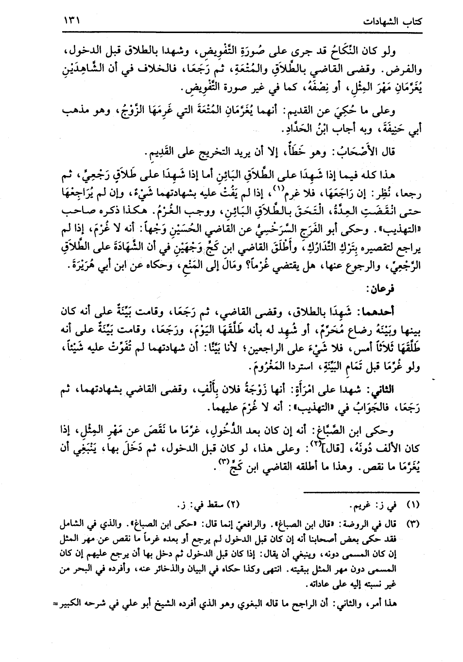 هذا كله فيما إذا شَهِدَا على الطَّلاَقِ البَائِنِ أما إذا شَهِدَا على طَلاَقٍ رَجْعِيٍّ، ثم رجعا، نُظِر: إن رَاجَعَهَا، فلا غرم (¬1)، إذا لم يَفُتْ عليه بشهادتهما شَيْءٌ، وإن لم يُرَاجِعْهَا حتى انْقَضَتِ العِدَّةُ، الْتَحَقَ بالطَّلاَقِ البَائِنِ، ووجب الغُرْمُ. هكذا ذكره صاحب "التهذيب". وحكى أبو الفَرَج السَّرَخْسِيُّ عن القاضي الحُسَيْنِ وَجْهاً: أنه لا غُرْمَ، إذا لم يراجع لتقصيره بِتَرْكِ التَّدَارُكِ، وأَطْلَقَ القاضي ابن كَجٍّ وجْهَيْنِ في أن الشَّهَادَةَ على الطَّلاَقِ الرَّجْعِيِّ، والرجوع عنها، هل يقتضي غُرْماً؟ ومَالَ إلى المَنْعِ، وحكاه عن ابن أبي هُرَيْرَةَ.