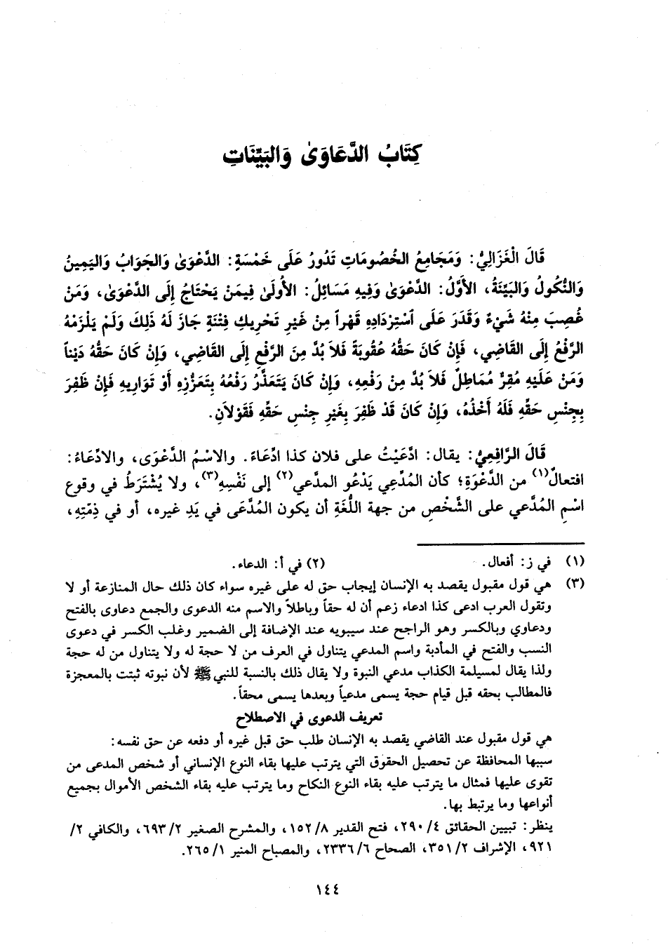 (¬3) هي قول مقبول يقصد به الإنسان إيجاب حق له على غيره سواء كان ذلك حال المنازعة أو لا وتقول العرب ادعى كذا ادعاء زعم أن له حقاً وباطلاً والاسم منه الدعوى والجمع دعاوى بالفتح ودعاوي وبالكسر وهو الراجح عند سيبويه عند الإضافة إلى الضمير وغلب الكسر في دعوى النسب والفتح في المأدبة واسم المدعي يتناول في العرف من لا حجة له ولا يتناول من له حجة ولذا يقال لمسيلمة الكذاب مدعي النبوة ولا يقال ذلك بالنسبة للنبي -صلى الله عليه وسلم- لأن نبوته ثبتت بالمعجزة فالمطالب بحقه قبل قيام حجة يسمى مدعياً ويعدها يسمى محقاً.