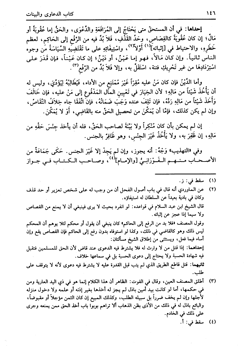 إحداها: في أن المستحقّ متى يَحْتَاح إلى المُرَافَعَةِ والدَّعْوَى، والحَقُّ إما عُقُوبَةٌ أو مَالٌ؛ إن كان عُقُوبَةً كالقِصَاصِ، وحَدِّ القَذْفِ، فَلاَ بُدَّ فيه من الرَّفْعِ إلى الحَاكِمِ، لعظم خَطَرِهِ، والاحتياط في [إثباته] (¬1) أَوَّلاً (¬2)، واسْتِيفَائِهِ على ما تَقْتَضِيهِ السِّيَاسَةُ من وجوه الناس ثانياً. وإن كان مَالاً، فهو إما عَيْنٌ، أو دَيْنٌ؛ إن كان عَيْناً، فإن قَدَرَ على اسْتِرْدَادِهَا من غير تَحْرِيكِ فتنة، اسْتَقَلَّ به، وإلا فَلاَ بُدَّ من الرَّفْعِ (¬3).