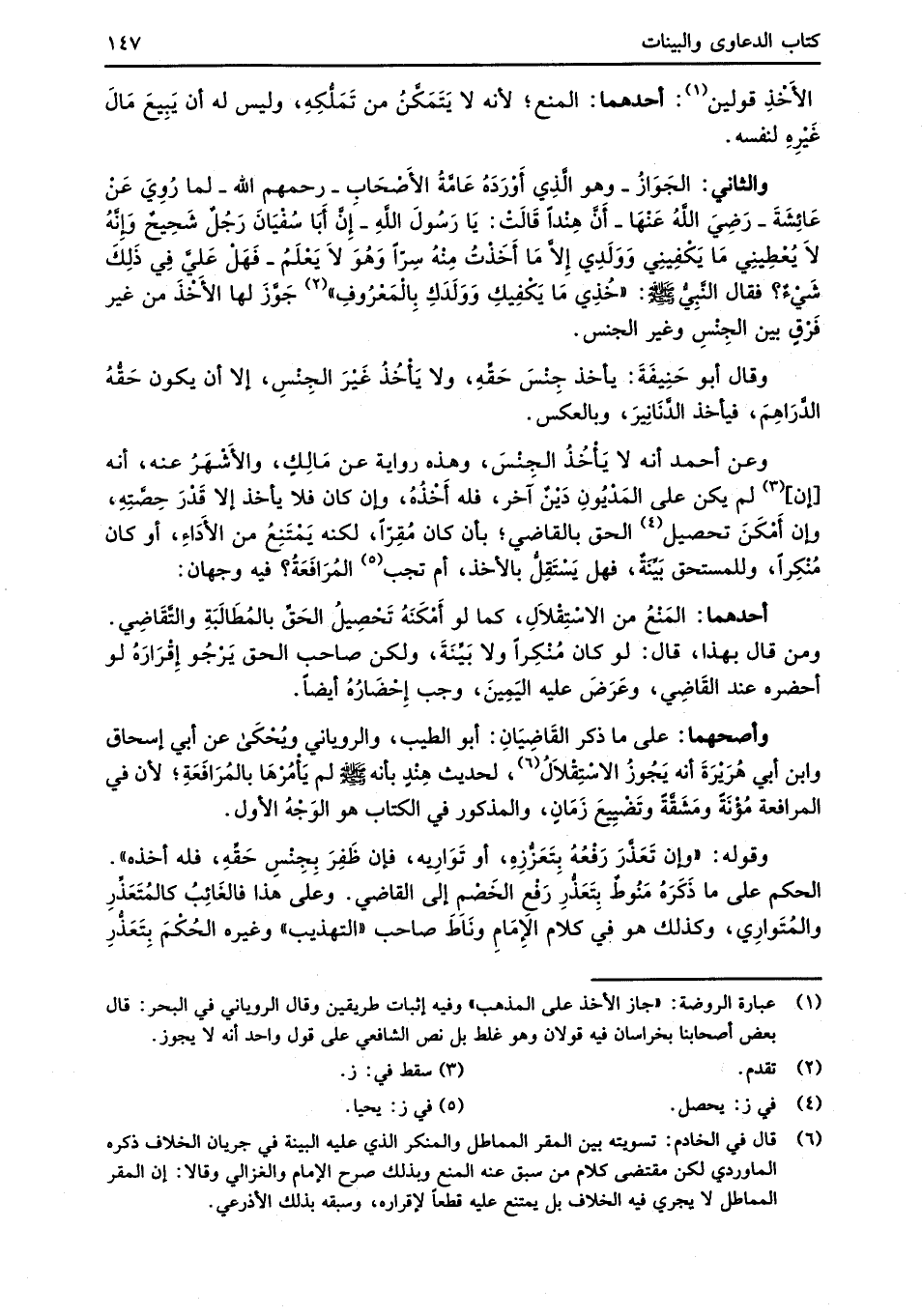 والثاني: الجَوَازُ -وهو الَّذِي أَوْرَدَهُ عَامَّةُ الأَصْحَاب -رحمهم الله- لما رُوِيَ عَنْ عَائِشَةَ -رَضِيَ اللهُ عَنْهَا- أَنَّ هِنْداً قَالَتْ: يَا رَسُولَ اللهِ -إِنَّ أَبَا سُفْيَانَ رَجْلٌ شَحِيحٌ وَإِنَّهُ لاَ يُعْطِينِي مَا يَكْفِينِي وَوَلَدِي إِلاَّ مَا أَخَذْتُ مِنْهُ سِرّاً وَهُوَ لاَ يَعلَمُ- فَهَل عَليَّ في ذَلِكَ شَيْءٌ؟ فقال النَّبيُّ -صلى الله عليه وسلم-: "خُذِي مَا يَكْفِيكِ وَوَلَدَكِ بِالْمَعْرُوفِ" (¬2) جَوَّزَ لها الأخْذَ من غير فَرْقٍ بين الجِنْسِ وغير الجنس.