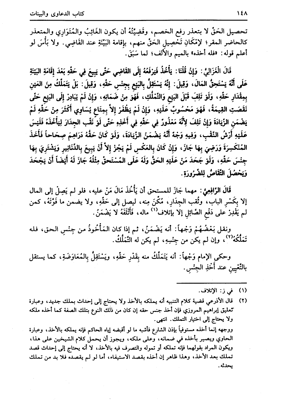 قَالَ الْغَزَالِيُّ: وَإِنْ قُلْنَا: يَأْخُذُ فَيَرْفَعُهُ إلَى القَاضِي حَتَّى يَبِيعَ فِي حَقِّهِ بَعْدَ إِقَامَةِ البَيِّنَةِ عَلَى أنَّهُ يَسْتَحِقُّ المَالَ، وَقِيلَ: إِنَّهُ يَسْتَقِلُّ بِالبَيْعِ بِجِنْسِ حَقِّهِ، وَقِيلَ: بَلْ يَتَمَلَّكُ مِنَ العَيْنِ بِمِقْدَارِ حَقِّهِ، وَلَوْ تَلِفَ قَبْلَ البَيْعِ وَالتَّمْلُّكِ، فَهُوَ مِنْ ضَمَانِهِ، وَإِنْ لَمْ يُبَادِر إِلَى البَيْعِ حَتَّى نَقَصَتِ القِيمَةُ، فَهُوَ مَحْسُوبٌ عَلَيْهِ، وَإِنْ لَمْ يَظْفَر إِلاَّ بِمِتَاعٍ يُسَاوِي أَكْثَرَ مِنْ حَقِّهِ لَمْ يَضْمَنِ الزِّيَادَةَ وَإِنْ تَلِفَ لِأَنَّهُ مَعْذُورٌ فِي حَقِّهِ فِي أَخْذِهِ حَتَّى لَوْ نَقَّب الجِدَارَ لِيَأْخُذَهُ فَلَيْسَ عَلَيْهِ أَرْشُ النَّقْبِ، وَفيهِ وَجْهٌ أنَّهُ يَضْمَنُ الزِّيَادَةَ، وَلَوْ كَانَ حَقُّهُ دَرَاهِمَ صِحَاحاً فَأَخَذَ المُنْكَسِرَةَ وَرَضِيَ بِهَا جَازَ، وَإِنْ كَانَ بالعَكْسِ لَمْ يَجُزْ إلاَّ أَنْ يَبِيعَ بِالدَّنَانِيرِ وَيَشْتَرِيَ بِهَا جِنْسَ حَقِّهِ، وَلَوْ جَحَدَ مَنْ عَلَيْهِ الحَقُّ وَلَهُ عَلَى المُسْتَحقِّ مِثْلُهُ جَازَ لَهُ أَيْضَاً أَنْ يَجْحَدَ وَيَحْصُلَ التَّقَاصُّ لِلضَّرُورَةِ.
