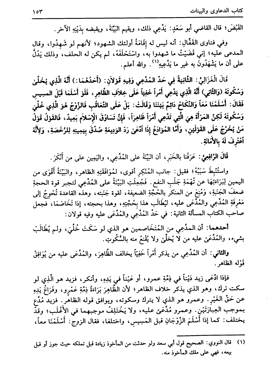 قَالَ الْغَزَالِيُّ: الثَّانِيَةُ فِي حَدِّ المُدَّعِي وَفِيهِ قَوْلاَنِ: (أَحَدُهُمَا): أنَّهُ الَّذِي يُخَلَّي وَسُكُوتَهُ (وَالثَّانِي) أَنَّهُ الَّذِي يَدَّعِي أَمْراً خَفِيّاَ عَلَى خِلاَفِ الظَّاهِرِ فَلَوْ أَسْلَمَا قَبْلَ المسِيسِ فَقَالَ: أَسْلَمْنَا مَعَاً وَالنِّكَاحُ دَائِمٌ بَيْنَنَا وَقَالَتْ: بَلْ عَلَى التَّعَاقُبِ فَالزَّوْجُ هُوَ الَّذِي خُلِّيَ وَسُكُوتَهُ لَكِنَّ المَرْأَةَ هِيَ الَّتِي تَدَّعِي أَمْرَاً ظَاهِراً، فإنَّ تَسَاوُقَ الإِسْلاَم بَعِيدٌ، فَالقَوْلُ قَوْلُ مَنْ يُخَرِّجُ عَلَى القَوْلَيْنِ، وَأَمَّا المُوَادَعُ إِذَا ادَّعَى رَدّ الوَدِيعَةِ صُدِّقَ بِيَمِينِهِ لِلرُّخْصَةِ، وَلِأَنَّهُ اعْتُرِفَ لَهُ بِالأَمَانَةِ.