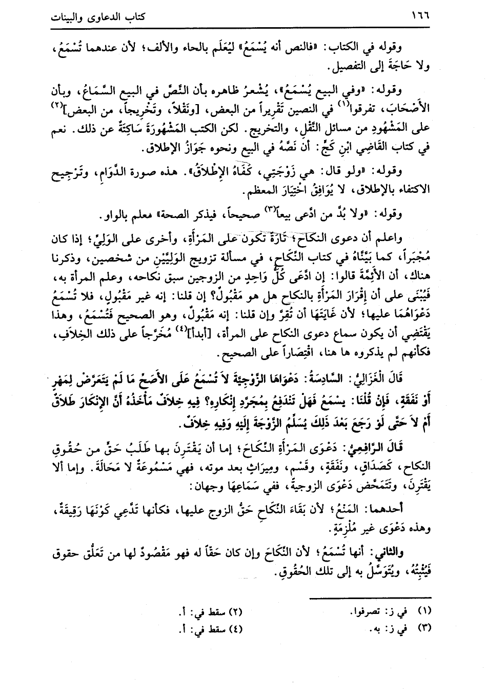قَالَ الرَّافِعِيُّ: دَعْوَى المَرْأَةِ النِّكَاحَ؛ إما أن يَقْتَرِنَ بها طَلَبُ حَقٍّ من حُقُوقِ النكاحِ، كَصَدَاقٍ، ونَفَقَةٍ، وقَسْمٍ، ومِيرَاثٍ بعد موته، فهي مَسْمُوعَةٌ لا مَحَالَةَ. وإما ألا يَقْتَرِنَ، وتَتَمَحَّض دَعْوَى الزوجية، ففي سَمَاعِهَا وجهان:
