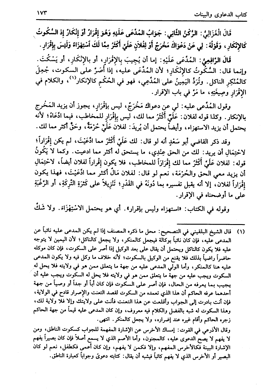 قَالَ الْغَزَالِيُّ: الرُّكْنُ الثَّانِي: جَوَابُ المُدَّعَي عَلَيْهِ وَهُوَ إِقْرَارٌ أوْ إِنْكَارٌ إذ السُّكُوتُ كَالإِنْكَارِ، وَقَوْلُهُ: لِي عَنْ دَعْوَاكَ مَخْرَجٌ أوْ لِفُلانٍ عَلَيَّ أَكْثَرُ مِمَّا لَكَ اسْتِهْزَاءٌ وَلَيْسَ بِإِقْرَارٍ.