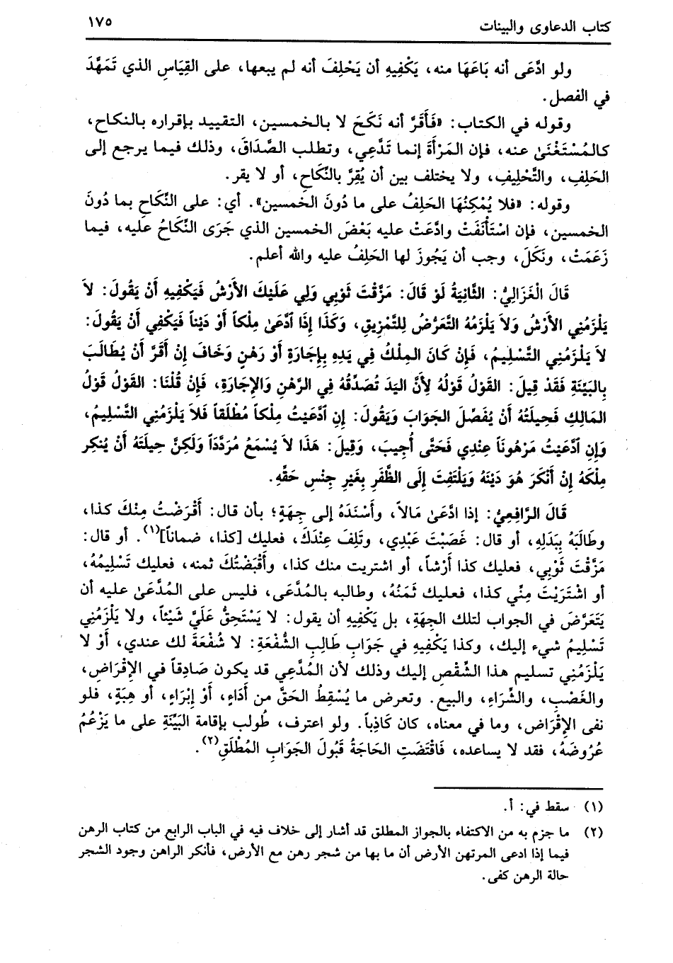 قَالَ الرَّافِعِيُّ: إذا ادَّعَى مَالاً، وأَسْنَدَهُ إلى جِهَةٍ؛ بأن قال: أَقْرَضْتُ مِنْكَ كذا، وطَالَبَهُ بِبَدَلِهِ، أو قال: غَصَبْتَ عَبْدِي، وتَلِفَ عِنْدَكَ، فعليك [كذا, ضماناً] (¬1). أو قال: مَزَّقْتَ ثَوْبِي، فعليك كذا أَرْشاً، أو اشتريت منك كذا، وأَقْبَضْتُكَ ثمنه، فعليك تَسْلِيمُهُ، أو اشْتَرَيْتَ مِنِّي كذا، فعليك ثَمَنُهُ، وطالبه بالمُدَّعَى، فليس على المُدَّعَى عليه أن يَتَعَرَّضَ في الجواب لتلك الجِهَةِ، بل يَكْفِيهِ أن يقول: لا يَسْتَحِقُّ عَلَيَّ شَيْئاً, ولا يَلْزَمُنِي تَسْلِيمُ شيء إليك، وكذا يَكْفِيهِ في جَوَاب طَالِبِ الشُّفْعَةِ: لا شُفْعَةَ لك عندي، أَوْ لا يَلْزَمُنِي تسليم هذا الشِّقْصِ إليك وذلكَ لأن المُدَّعِي قد يكون صَادِقاً في الإِقْرَاضِ، والغَصْبِ، والشِّرَاءِ، والبيع. وتعرض ما يُسْقِطُ الحقَّ من أَدَاءٍ، أَوْ إِبْراءٍ، أو هِبَةٍ، فلو نفى الإِقْرَاض، وما في معناه، كان كَاذِباً. ولو اعترف، طُولب بإقامة البَيِّنَةِ على ما يَزْعُمُ عُرُوضَهُ، فقد لا يساعده، فَاقْتَضَتِ الحَاجَةُ قَبُولَ الجَوَابِ المُطْلَقِ (¬2).