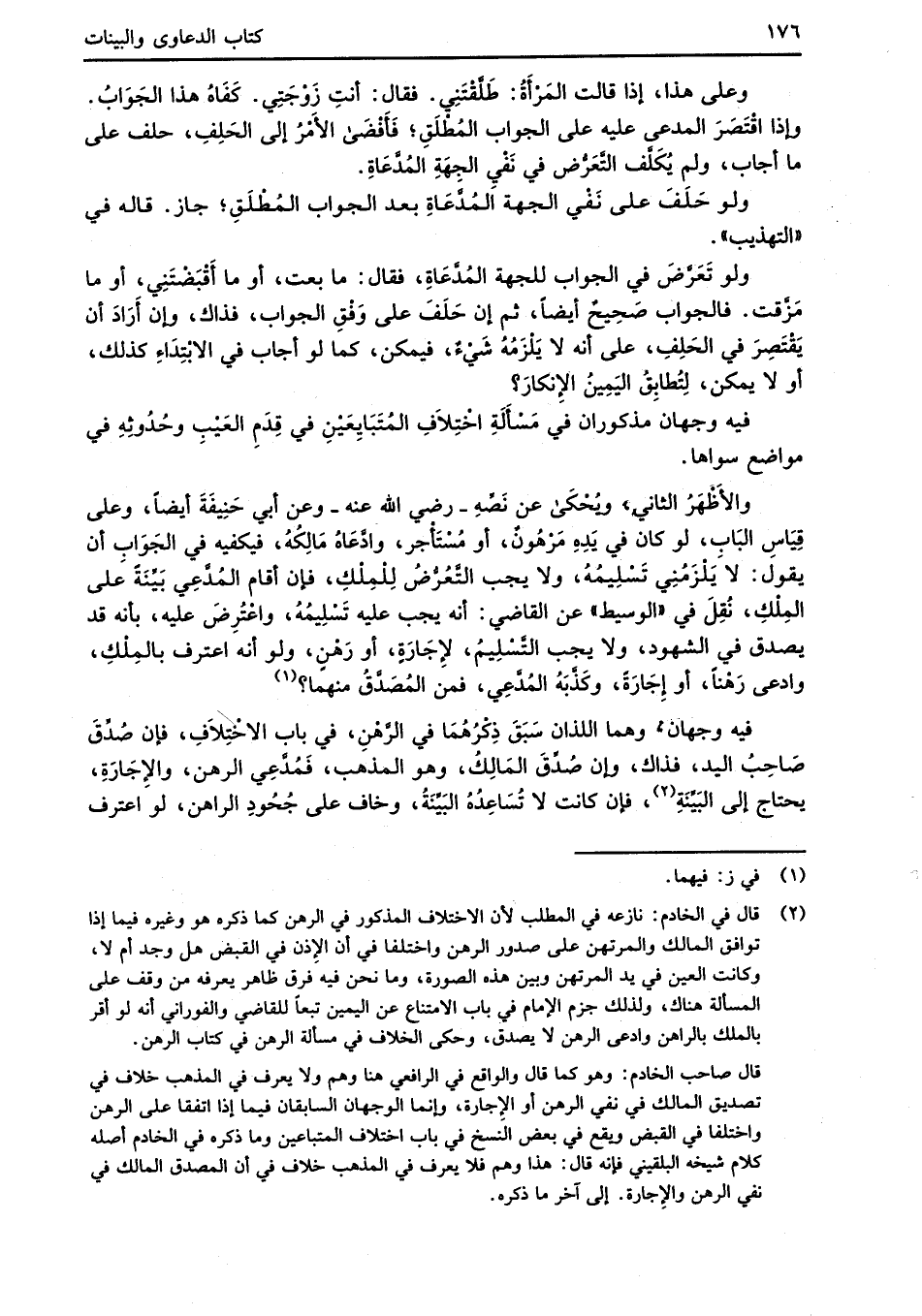 وعلى هذا، إذا قالت المَرْأَةُ: طَلَّقْتَنِي. فقال: أنتِ زَوْجَتِي. كَفَاهُ هذا الجَوَابُ. وإذا اقْتَصَرَ المدعى عليه على الجواب المُطْلَقِ؛ فَأَفْضَى الأَمْرُ إلى الحَلِفِ، حلف على ما أجاب، ولم يُكَلَّف التَّعَرُّض في نَفْي الجِهَةِ المُدَّعَاةِ.