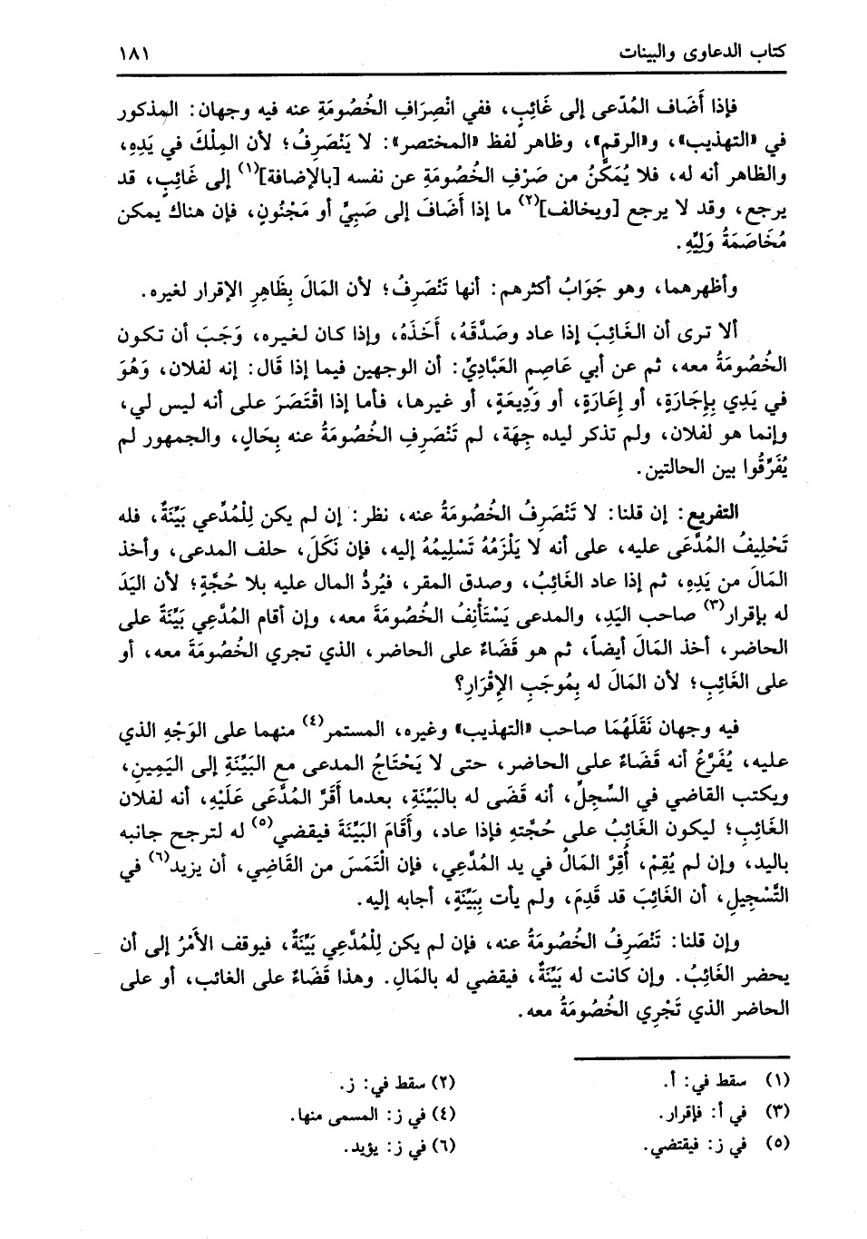 فإِذا أَضَاف المُدَّعى إلى غَائِبٍ، ففي انْصِرَافِ الخُصُومَةِ عنه فيه وجهان: المذكور في "التهذيب"، و"الرقم"، وظاهر لفظ "المختصر": لا يَنْصَرِفُ؛ لأن المِلْكَ في يَدِهِ، والظاهر أنه له، فلا يُمَكَّنُ من صَرْفِ الخُصُومَةِ عن نفسه [بالإضافة] (¬1) إلى غَائِبٍ، قد يرجع، وقد لا يرجع [ويخالف] (¬2) ما إذا أَضَافَ إلى صَبِيٍّ أو مَجْنُونٍ، فإن هناك يمكن مُخَاصَمَةُ وَليِّهِ.