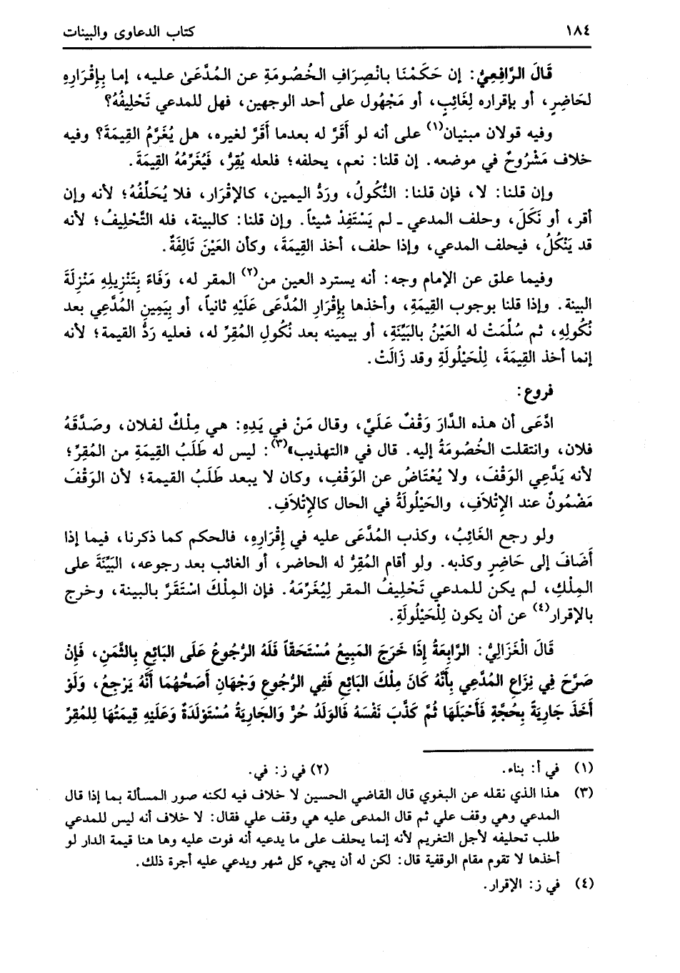 (¬3) هذا الذي نقله عن البغوي قال القاضي الحسين لا خلاف فيه لكنه صور المسألة بما إذا قال المدعي وهي وقف علي ثم قال المدعى عليه هي وقف علي فقال: لا خلاف أنه ليس للمدعي طلب تحليفه لأجل التغريم لأنه إنما يحلف على ما يدعيه أنه فوت عليه وهاهنا قيمة الدار لو أخذها لا تقوم مقام الوقفية قال: لكن له أن يجيء كل شهر ويدعي عليه أجرة ذلك.