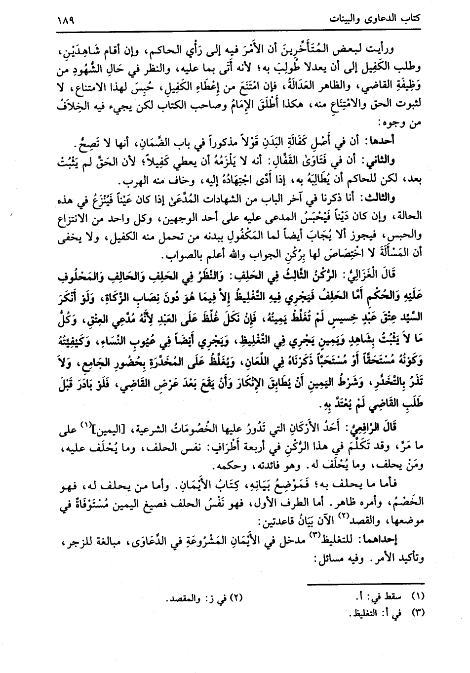 قَالَ الْغَزَالِيُّ: الرُّكْنُ الثَّالِثُ فِي الحَلِفِ: وَالنَّظَرُ فِي الحَلِفِ وَالحَالِفِ وَالمَحْلُوفِ عَلَيْهِ وَالحُكْمِ أَمَّا الحَلِفُ فَيَجْرِي فِيهِ التَّغْلِيظُ إِلاَّ فِيمَا هُوَ دُونَ نِصَابِ الزَّكَاةِ، وَلَوْ أَنْكَرَ السَّيِّد عِتْقَ عَبْدٍ خسيسٍ لَمْ تُغَلَّظ يَمِينُهُ، فَإِنْ نكَلَ غُلِّظَ عَلَى العَبْدِ لِأَنَّهُ مُدَّعِي العِتْقِ، وَكُلُّ مَا لاَ يَثْبُتُ بِشَاهِدٍ وَيمِينٍ يَجْرِي في التَّغْلِيظِ، وَيَجْرِي أَيْضَاً في عُيُوبِ النِّسَاءِ، وَكَيفِيَّتُهُ وَكَوْنُهُ مُسْتَحَقاً أَوْ مُسْتَحَبَّاً ذَكَرْنَاهُ فِي اللِّعَانِ، وَيُغَلَّظُ عَلَى المُخَدَّرَةِ بِحُضُورِ الجَامِعِ، وَلاَ تَذَرُ بِالتَّخَدُّرِ، وَشَرْطُ اليَمِينِ أَنْ يُطَابِقَ الإِنْكَارَ وإنْ يَقَعَ بَعْدَ عَرْضِ القَاضِي، فَلوْ بَادَرَ قَبْلَ طَلَبِ القَاضِي لَمْ يُعْتَدَّ بِهِ.