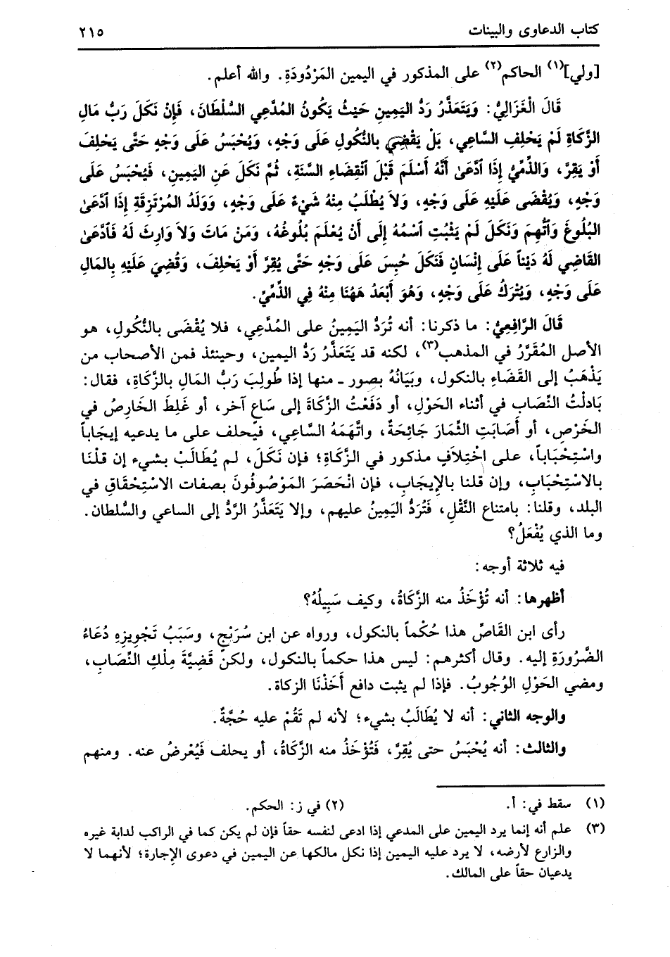 رأى ابن القَاصِّ هذا حُكْماً بالنكول، ورواه عن ابن سُرَيْجٍ، وسَبَب تَجْوِيزِهِ دُعَاءُ الضَّرُورَةِ إليه. وقال أكثرهم: ليس هذا حكماً بالنكول، ولكن قَضِيَّةَ مِلْكِ النِّصَاب، ومضي الحَوْلِ الوُجُوبُ. فإذا لم يثبت دافع أَخَذْنَا الزكاة.