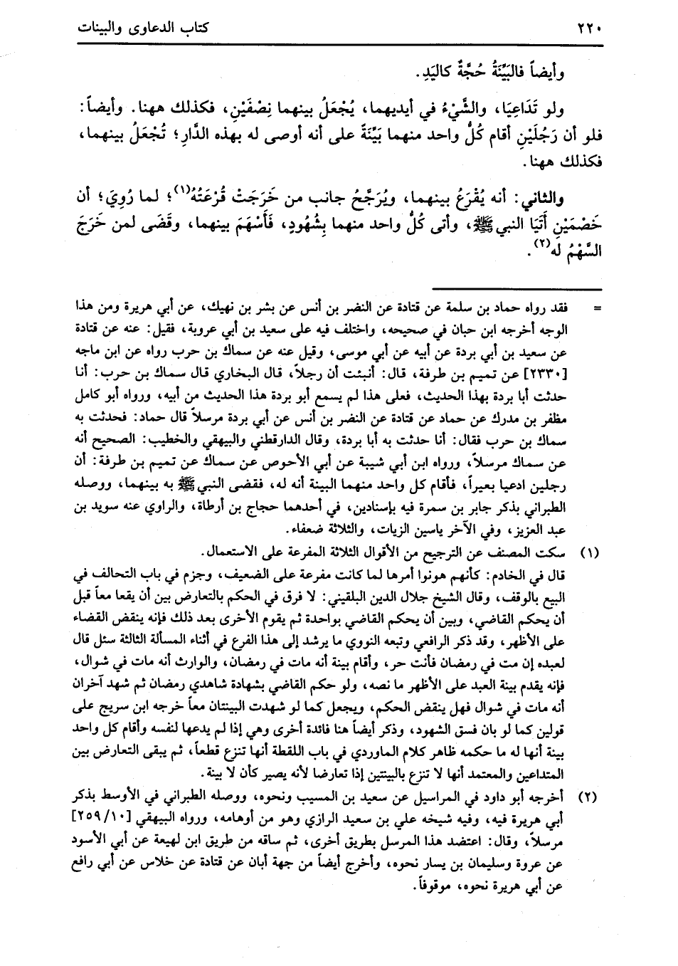 = فقد رواه حماد بن سلمة عن قتادة عن النضر بن أنس عن بشر بن نهيك، عن أبي هريرة ومن هذا الوجه أخرجه ابن حبان في صحيحه، واختلف فيه على سعيد بن أبي عروبة، فقيل: عنه عن قتادة عن سعيد بن أبي بردة عن أبيه عن أبي موسى، وقيل عنه عن سماك بن حرب رواه عن ابن ماجه [2330] عن تميم بن طرفة، قال: أنبئت أن رجلاً، قال البخاري قال سماك بن حرب: أنا حدثت أبا بردة بهذا الحديث، فعلى هذا لم يسمع أبو بردة هذا الحديث من أبيه، ورواه أبو كامل مظفر بن مدرك عن حماد عن قتادة عن النضر بن أنس عن أبي بردة مرسلاً قال حماد: فحدثت به سماك بن حرب فقال: أنا حدثت به أبا بردة، وقال الدارقطني والبيهقي والخطيب: الصحيح أنَّه عن سماك مرسلاً، ورواه ابن أبي شيبة عن أبي الأحوص عن سماك عن تميم بن طرفة: أن رجلين ادعيا بعيراً، فأقام كل واحد منهما البينة أنَّه له، فقضى النبي -صلى الله عليه وسلم- به بينهما، ووصله الطبراني بذكر جابر بن سمرة فيه بإسنادين، في أحدهما حجاج بن أرطاة، والراوي عنه سويد بن عبد العزيز، وفي الآخر ياسين الزيات، والثلاثة ضعفاء.