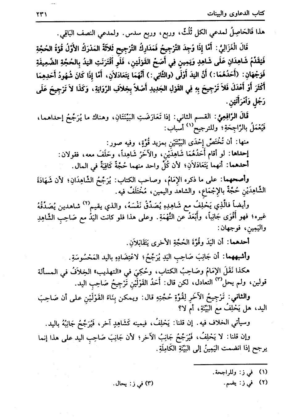قَالَ الْغَزَالِيُّ: أَمَّا إِذَا وُجِدَ التَّرْجِيحُ فَمَدَارِكُ التَّرْجِيحِ ثَلاَثَةٌ المَدْرَكُ الأَوَّلُ قُوَّةُ الحُجَّةِ فَيُقَدَّمُ شَاهِدَانِ عَلَى شَاهِدٍ وَيَمِينٍ في أَصَحِّ القَوْلَيْنِ، فَلَوِ اقْتَرَنَتِ اليَدُ بِالحُجَّةِ الضَّعِيفَةِ فَوَجْهَانِ: (أَحَدُهُمَا:) أَنَّ اليَدَ أَوْلَى (والثَّانِي:) أنَّهُمَا يَتَعَادَلاَنِ، أَمَّا إِذَا كَانَ شُهُودُ أَحَدِهِمَا أكْثَرَ أَوْ أَعْدَلَ فَلاَ تَرْجِيحَ بِهِ فِي القَوْلِ الجَدِيدِ أَصْلاً بِخِلاَفِ الرِّوَايَةِ، وَكَذَا لاَ تَرْجِيحَ عَلَى رَجُلٍ وَأمْرَأتينِ.