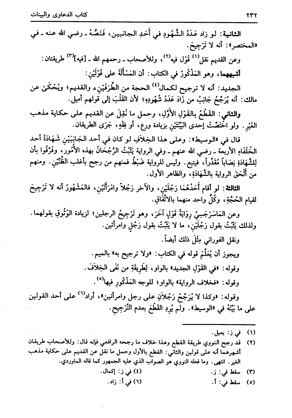 الجديد: أنَّه لا ترجيح لكمال (¬4) الحجة من الطَّرَفَيْنِ، والقديم؛ ويُحْكَى عن مالك: أنَّه يُرَجَّحُ جَانِبُ من زَادَ عَدَدُ شُهُودِهِ؛ لأن القَلْبَ إلى قولهم أميل.