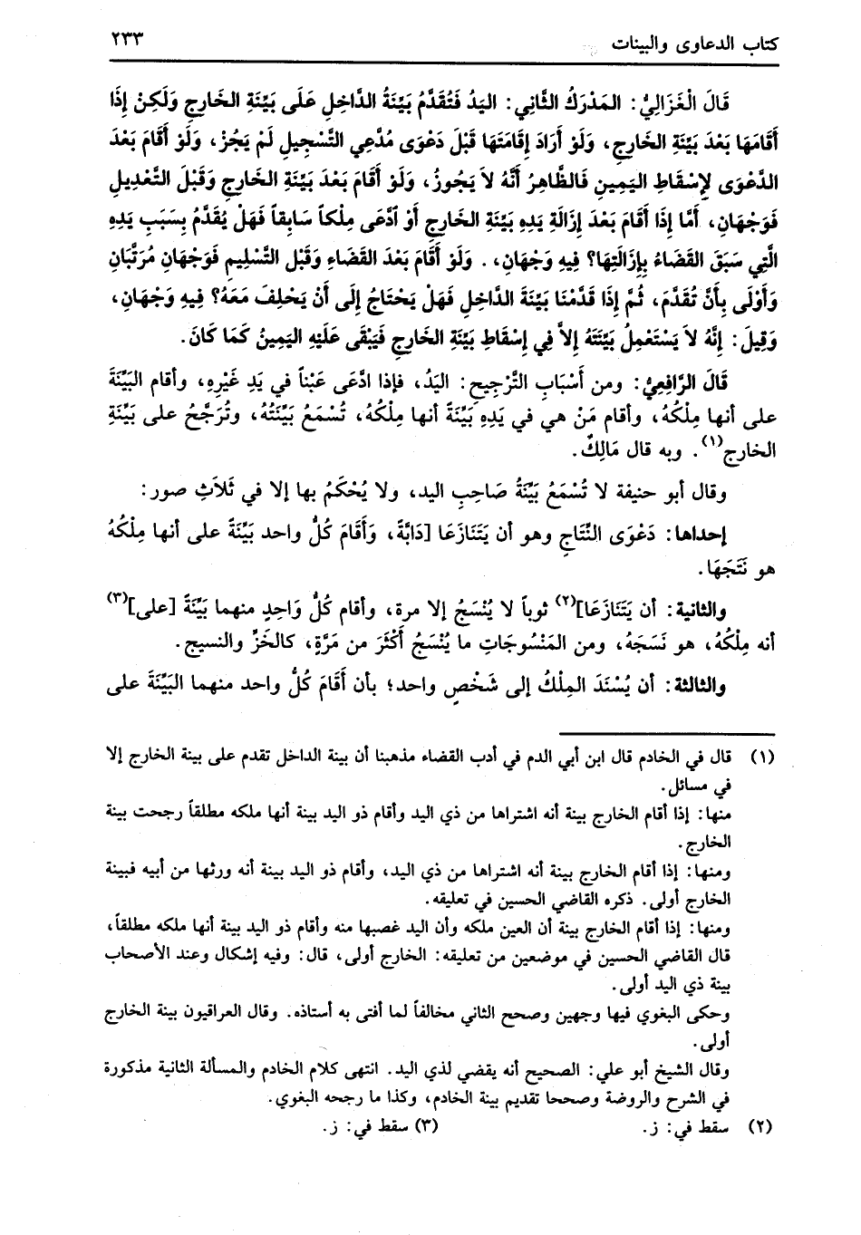 قَالَ الْغَزَالِيُّ: المَدْرَكُ الثَّانِي: اليَدُ فَتُقَدَّمُ بَيِّنَةُ الدَّاخِلِ عَلَى بَيِّنَةِ الخَارجِ وَلَكِنْ إِذَا أَقَامَهَا بَعْدَ بَيِّنَةِ الخَارجِ، وَلَوْ أَرَادَ إقَامَتَهَا قَبْلَ دَعْوَى مُدَّعِي التَّسْجِيلِ لَمْ يَجُزْ، وَلَوْ أقَامَ بَعْدَ الدَّعْوَى لإسْقَاطِ اليَمِينِ فَالظَّاهِرُ أنَّهُ لاَ يَجُوزُ، وَلَوْ أَقَامَ بَعْدَ بَيِّنَةِ الخَارجِ وَقَبْلَ التَّعْدِيلِ فوَجْهَانِ، أَمَّا إِذَا أَقَامَ بَعْدَ إزَالَةِ يَدِهِ بَيِّنَةِ الخَارجِ أَوْ ادَّعَى مِلْكاً سَابِقاً فَهَلْ يُقَدَّمُ بِسَبَبِ يَدِهِ الَّتِي سَبَقَ القَضَاءُ بِإزَالَتِهَا؟ فِيهِ وَجْهَانِ،. وَلَوْ أَقَامَ بَعْدَ القَضَاءِ وَقَبْل التَّسْلِيمِ فَوَجْهَانِ مُرَتَّبَانِ وَأَوْلَى بِأَنْ يُقَدَّمَ، ثُمَّ إِذَا قَدَّمْنَا بَيِّنَةَ الدَّاخِلِ فَهَلْ يَحْتَاجُ إلَى أن يَحْلِفَ مَعَهُ؟ فِيهِ وَجْهَانِ، وَقِيلَ: إنَّهُ لاَ يَسْتَعْمِل بَيِّنَتَهُ إلاَّ فِي إسْقَاطِ بَيِّنَةِ الخَارجِ فَيَبْقَى عَلَيْهِ اليَمِينُ كَمَا كَانَ.