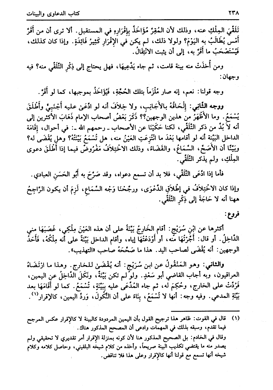 ووجه الثَّانِي: إِلْحَاقُهُ بالأَجَانِب، ولا خِلاَفَ أنَّه لو ادَّعَى عليه أَجْنَبيٌّ وأَطْلَقَ يُسْمَعُ. وما الأَظْهَرُ من هذين الوجهين؟؟ ذَكَرَ بَعْضُ أصحاب الإِمام ذَهَابَ الأَكثرين إلى أنَّه لاَ بُدَّ من ذكر التَّلَقِّي، لكنا حَكَيْنَا عن الأصحاب -رحمهم الله-: في أحوال، إِقَامَة الداخل البَيِّنة أنَّه لو أقامها بَعْدَ ما انْتُزِعَتِ العَيْنُ منه، هل تُسْمَعُ بَيِّنَتُهُ؟ وهل يُقْضَى له؟ وبَيَّنَّا أن الأَصَحَّ، السَّمَاعُ، والقَضَاءُ، وذلك الاختِلاَفُ مَفْرُوضٌ فيما إذا أَطْلَقَ دعوى المِلْكِ، ولم يذكر التَّلَقِّي.