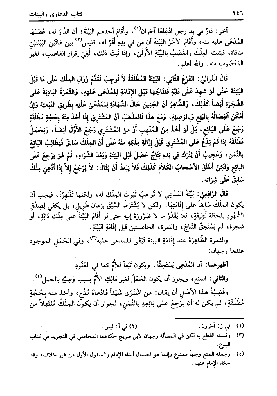 قَالَ الْغَزَالِيُّ: الفَرْعُ الثَّانِي: البَيِّنَةُ المُطْلَقَةُ لاَ تُوجِبُ تَقَدُّمَ زَوَالِ المِلْكِ عَلَى مَا قَبْلَ البَيِّنَة حَتَّى لَوْ شَهِدَ عَلَى دَابَّةٍ فَنِتَاجُهَا قَبْلَ الإِقَامَةِ لِلمُدَّعى عَلَيْهِ، وَالثَّمَرَةُ البَادِيَةُ عَلَى الشَّجَرَةِ أَيْضَاً كَذَلِكَ، وَالظَّاهِرُ أَنَّ الجَنِينَ حَالَ الشَّهَادَةِ لِلمُدَّعَى عَلَيْهِ بِطَرِيقِ التَّبَعِيَّةِ وَإِنْ أَمْكَنَ انْفِصَالُة بِالبَيْعِ وبِالوَصِيَّةِ، وَمَعَ هَذَا فَالمذْهَبُ أَنَّ المُشْتَرِيَ إِذَا أَخَذَ مِنْهُ بِحُجَّةٍ مُطلَقَةٍ رَجَعَ عَلَى البَائِعِ، بَل لَوْ أَخَذَ مِنَ المُتَّهِبِ أَوْ مِنَ المُشْتَرِي رَجَعَ الأَوَّلُ أَيْضَاً، وَيُحْمَلُ مُطلَقُهُ إِذَا لَمْ يَدْعُ عَلَى المُشْتَرِي قَبْلَ إزَالَةِ مِلْكِهِ منْهُ عَلَى أَنَّ المِلْكَ سَابِقٌ فَيُطَالِبُ البَائِعَ بالثَّمَنِ، وَعَجِيبٌ أنْ يُتْرَك فِي يَدِهِ نِتَاجٌ حَصَلَ قَبْلَ البَيِّنَةِ وَبَعْدَ الشِّرَاءِ، ثُمَّ هُوَ يَرْجِعُ عَلَى البَائِعِ وَلَكِنْ أَطْلَقَ الأَصْحَابُ الكَلاَمَ كَذَلِكَ فَلاَ يَبْعدُ أنْ يُقَالُ: لاَ يُرْجَعُ إلاَّ إِذَا ادَّعِيَ مِلْكٌ سَابِقٌ عَلَى شِرَاِئهِ.