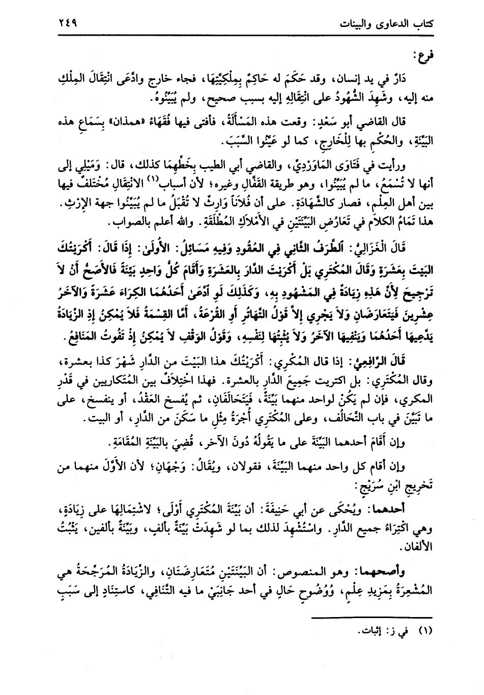 قَالَ الْغَزَالِيُّ: الطَّرَفُ الثَّانِي فِي العُقُودِ وَفِيهِ مَسَائِلُ: الأُولَى: إِذَا قَالَ: أكْرَيْتُكَ البَيْتَ بِعَشَرَةٍ وَقَالَ المُكْتَرِي بَلْ كَرَيتَ الدَّار بِالعَشَرَةِ وَأَقَامَ كُلُّ وَاحِدٍ بَيِّنَةً فَالأَصَحُّ أَنْ لاَ تَرْجِيحَ لِأَن هَذِهِ زِيَادَةٌ فِي المَشْهُودِ بِهِ، وَكَذَلِكَ لَوِ ادَّعَى أَحَدُهُمَا الكِرَاءَ عَشَرَةً وَالآخَرُ عِشْرِينَ فَيَتَعَارَضَانِ وَلاَ يَجْرِي إِلاَّ قَوْلُ التَّهَاتُرِ أَوِ القُرْعَةُ، أَمَّا القِسْمَةُ فَلاَ يُمْكِن إِذِ الزِّيَادَةُ يَدَّعِيهَا أَحَدُهُمَا وَيَنْفِيهَا الآخَرُ وَلاَ يُثْبِتُهَا لِنَفْسِهِ، وَقَوْلُ الوَقْفِ لاَ يُمْكِنُ إِذْ تَفُوتُ المَنَافِعْ.