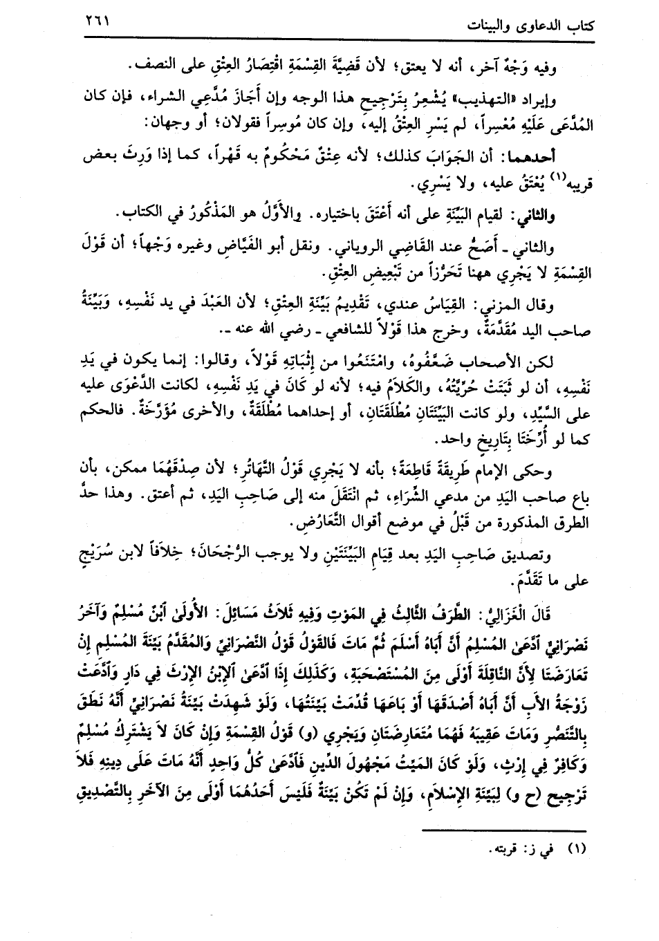 قَالَ الْغَزَالِيُّ: الطَّرَفُ الثَّالِثُ فِي المَوْتِ وَفِيهِ ثَلاَثُ مَسَائِلَ: الأُولَى ابْنٌ مُسْلِمٌ وَآخَرُ نَصْرَانِيٌّ ادَّعَى المُسْلِمُ أَنَّ أَبَاهُ أَسْلَمَ ثُمَّ مَاتَ فَالقَوْلُ قَوْلُ النَّصْرَانِيِّ وَالمُقَدَّمُ بَيِّنَةَ المُسْلِمِ إِنْ تَعَارَضَتَا لِأَنَّ النَّاقِلَةَ أَوْلَى مِنَ المُسْتَصْحَبَةِ، وَكَذَلِكَ إِذَا ادَّعَى الإِبْنُ الإرْثَ فِي دَارِ وَادَّعَتْ زَوْجَةُ الأَبِ أَنَّ أَبَاهُ أَصْدَقَهَا أَوْ بَاعَهَا قُدِّمَتْ بَيِّنَتُهَا، وَلَوْ شَهِدَتْ بَيِّنَة نَصْرَانِيِّ أنَّهُ نَطَقَ بِالتَّنَصُّرِ وَمَاتَ عَقِيبَهُ فَهُمَا مُتَعَارِضَتَانِ وَيَجْرِي (و) قَوْلُ القِسْمَةِ وَإِنْ كَانَ لاَ يَشْتَرِك مُسْلِمٌ وَكَافِرٌ فِي إرْثٍ، وَلَوْ كَانَ المَيِّتُ مَجْهُولَ الدِّينِ فَادَّعَى كُلُّ وَاحِدٍ أنَّهُ مَاتَ عَلَى دِينِهِ فَلاَ تَرْجِيح (ح و) لِبَبِّنَةِ الإِسْلاَمِ، وَإِنْ لَمْ تَكُنْ بَيِّنَةٌ فَلَيْسَ أَحَدُهُمَا أَوْلَى مِنَ الآخَرِ بِالتَّصْدِيقِ