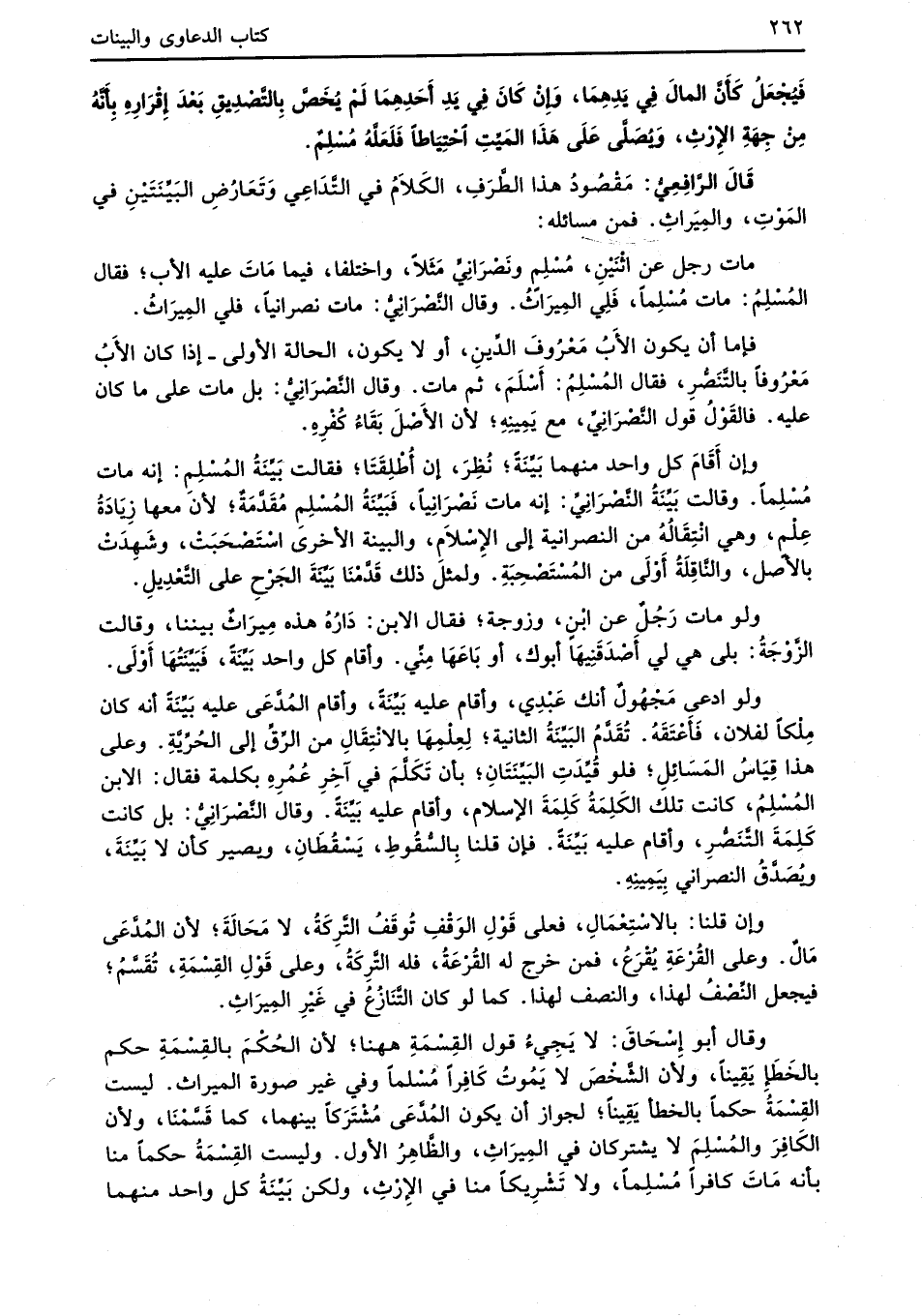 وقال أبو إِسْحَاقَ: لا يَجِيءُ قول القِسْمَةِ هاهنا؛ لأن الحُكْمَ بالقِسْمَةِ حكم بالخَطَإ يَقِيناً، ولأن الشَّخْصَ لا يَمُوتُ كَافِراً مُسْلماً وفي غير صورة الميراث. ليست القِسْمَةُ حكماً بالخطأ يَقِيناً؛ لجواز أن يكون المُدَّعَى مُشْتَرَكاً بينهما، كما قَسَّمْنَا، ولأن الكَافِرَ والمُسْلِمَ لا يشتركان في المِيرَاثِ، والظَّاهِرُ الأول. وليست القِسْمَةُ حكماً منا بأنه مَاتَ كافراً مُسْلِماً، ولا تَشْرِيكاً منا في الإِرْثِ، ولكن بَيِّنَةُ كل واحد منهما
