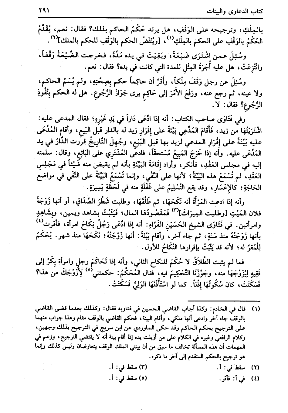 (¬1) قال في الخادم: وكذا أجاب القاضي الحسين في فتاويه فقال؛ وكذلك بعدما قضى القاضي بالوقف جاء آخر وادعى أنها ملكي، وأقام البينة، فحكم القاضي بالوقف مقام وهذا جواب منهما على الترجيح بحكم الحاكم وقد حكى الماوردي عن ابن سريج في الترجيح بذلك وجهين، وكلام الرافعي وغيره في الكلام على من أزيلت يده إذا أقام بينة أنه لا يقتضي الترجيح، وزعم في المهمات أن هذه المسألة تخالف ما سبق من أن بينتي الملك الوقف يتعارضان وليس كذلك وإنما هو ترجيح بالحكم المتقدم إلى آخر ما ذكره.