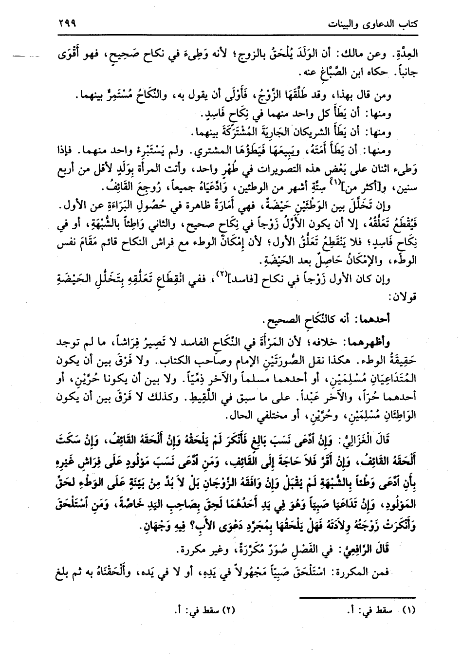 وأظهرهما: خلافه؛ لأن المَرْأَةَ في النِّكَاحِ الفاسد لا تَصِيرُ فِرَاشاً، ما لم توجد حَقِيقَةُ الوطء. هكذا نقل الصُّورَتَيْنِ الإِمام وصاحب الكتاب. ولا فَرْقَ بين أن يكون المُتَدَاعِيَانِ مُسْلِمَيْنِ، أو أحدهما مسلماً والآخر ذِمِّيّاً. ولا بين أن يكونا حُرَّيْنِ، أو أحدهما حُرّاً، والآخر عَبْداً. على ما سبق في اللَّقِيطِ. وكذلك لا فَرْقَ بين أن يكون الوَاطِئَانِ مُسْلِمَيْنِ، وحُرَّيْنِ، أو مختلفي الحال.