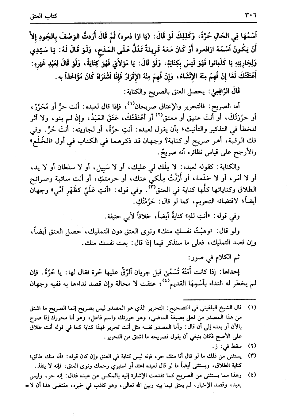 (¬3) يستثنى من ذلك ما لو قال أنا منك حر، فإنه ليس كناية في العتق وإن كان قوله: "أنا منك طالق" كناية الطلاق، ويستثنى أيضاً ما لو قال لعبده اعتد أو استبري رحمك ونوى العتق، فإنه لا ينفذ.