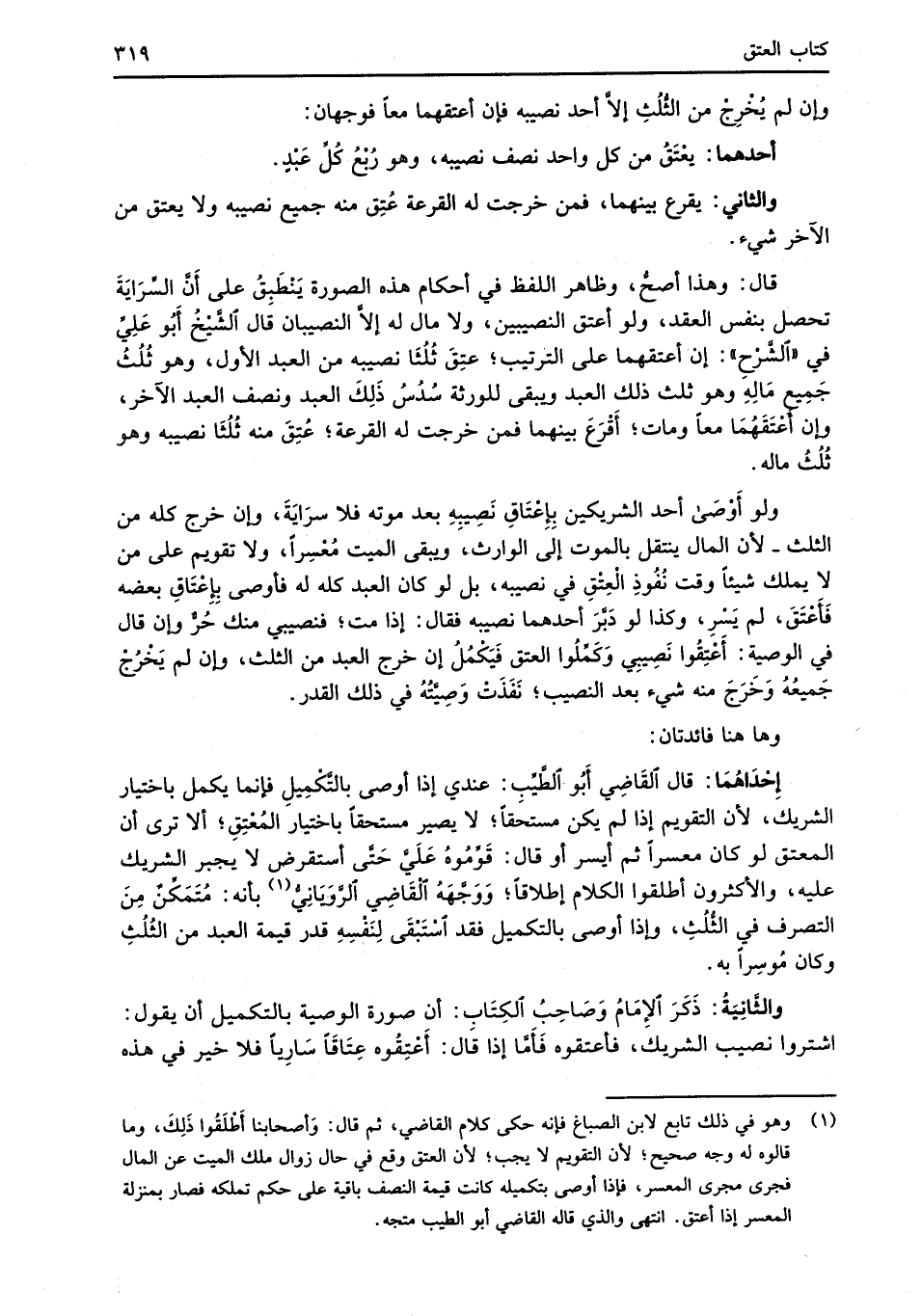 إِحْدَاهُمَا: قال القَاضِي أَبُو الطَّيِّب: عندي إذا أوصى بالتَّكْمِيلِ فإنما يكمل باختيار الشريك؛ لأن التقويم إذا لم يكن مستحقاً؛ لا يصير مستحقاً باختيار المُعْتِقِ؛ ألا ترى أن المعتق لو كان معسراً ثم أيسر أو قال: قَوِّمُوهُ عَلَيَّ حَتَّى أستقرض لا يجبر الشريك عليه، والأكثرون أطلقوا الكلام إطلاقاً؛ وَوَجَّهَهُ الْقَاضِي الرَّوَيانِيُّ (¬1) بأنه: مُتَمَكِّنٌ مِنَ التصرف في الثُّلُثِ، وإذا أوصى بالتكميل فقد اسْتَبْقَى لِنَفْسِهِ قدر قيمة العبد من الثُلُثِ وكان مُوسِراً به.
